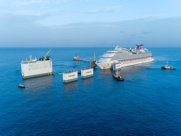 El BOKA Vanguard es un buque semisumergible especializado en transporte de grandes cargas. Se suele usar, como la mayor parte de los de su clase, para transportar plataformas petrolíferas desde el dique seco donde se construyen hasta su ubicación sobre el depósito de petróleo o gas natural correspondiente. Lo que lo hace especial es que es el más grande de su tipo jamás construido: 275 metros de eslora, 80 de manga y 110.000 toneladas de desplazamiento, que vienen a ser lo que pesan la Torre Picasso, noventa mil Volkswagen Golf o la totalidad de la población de la ciudad de Barcelona, por hacer comparaciones enloquecidas. El pasado sábado el Vanguard sirvió de dique seco al Carnival Vista, un crucero de 325 metros de eslora de la Carnival Cruise Line basado en Galveston, Texas, y que suele hacer rutas caribeñas de una semana visitando lugares como Aruba o Jamaica.