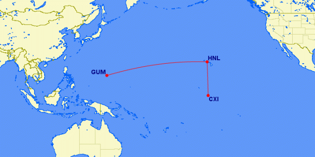Para terminar recalaremos en el aeropuerto de Honolulu. Será en la capital hawaiana donde aterrizarán nuestros dos últimos vuelos transanuales. El primero de ellos a las 10 horas y 40 minutos de la mañana, procedente de Kiritimati, la isla más oriental de Kiribati y junto con Samoa y Tokelau el primer territorio en entrar al año nuevo. Una vez por semana un Boeing 737 de la Fiji Airways parte del aeropuerto de Nadi y tras una breve escala en Kiritimati, la Isla de la Navidad, sigue su camino hacia Honolulú. La hora prevista de salida es las siete y media de la mañana, y la duración del vuelo de apenas 3 horas y 10 minutos. Ya por la tarde llegará el último de nuestros vuelos cronoviajeros: un avión de la United Airlines que tras partir de Guam a las ocho menos veinte de la mañana del 1 de enero llegará a Hawái a las siete menos cuarto de la tarde del 31 de diciembre