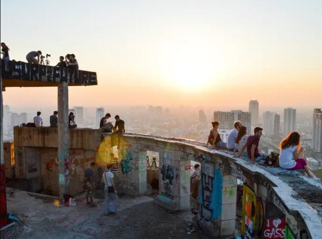 Al atardecer decenas de jóvenes se juntan en la azotea para contemplar la puesta de sol sobre la ciudad. Lo normal en cualquier rascacielos abandonado, vamos (News Australia)