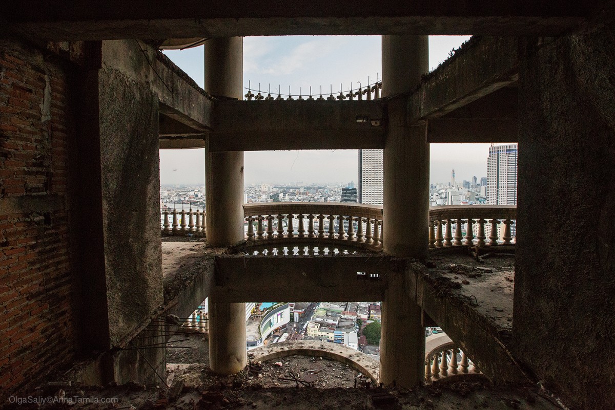 A mediados de los noventa era fácil ser optimista en Tailandia. El crecimiento económico llevaba una década en cifras cercanas o por encima de los dos dígitos anuales; de hecho el país disfrutaba de las mayores tasas de crecimiento entre todas las naciones del mundo. Enormes masas de población escapaban de la pobreza extrema, y Bangkok se modernizaba a pasos agigantados. El dinero extranjero fluía a chorros hacia el país y hacía falta un lugar donde los nuevos ricos locales pudieran mostrarle al mundo su riqueza. Una torre de 175 metros de alto con seiscientos apartamentos de lujo y cincuenta locales comerciales reservados para las marcas más exclusivas del planeta sería el escaparate perfecto. Las mejores vistas de la ciudad, las mejores tiendas del país. Se pusieron los cimientos, se levantaron las 49 plantas del edificio, se revistió de hormigón la estructura, se pusieron cables y cañerías, y entonces, en 1997, cuando apenas quedaba una pequeña parte del trabajo, la construcción fue abandonada.