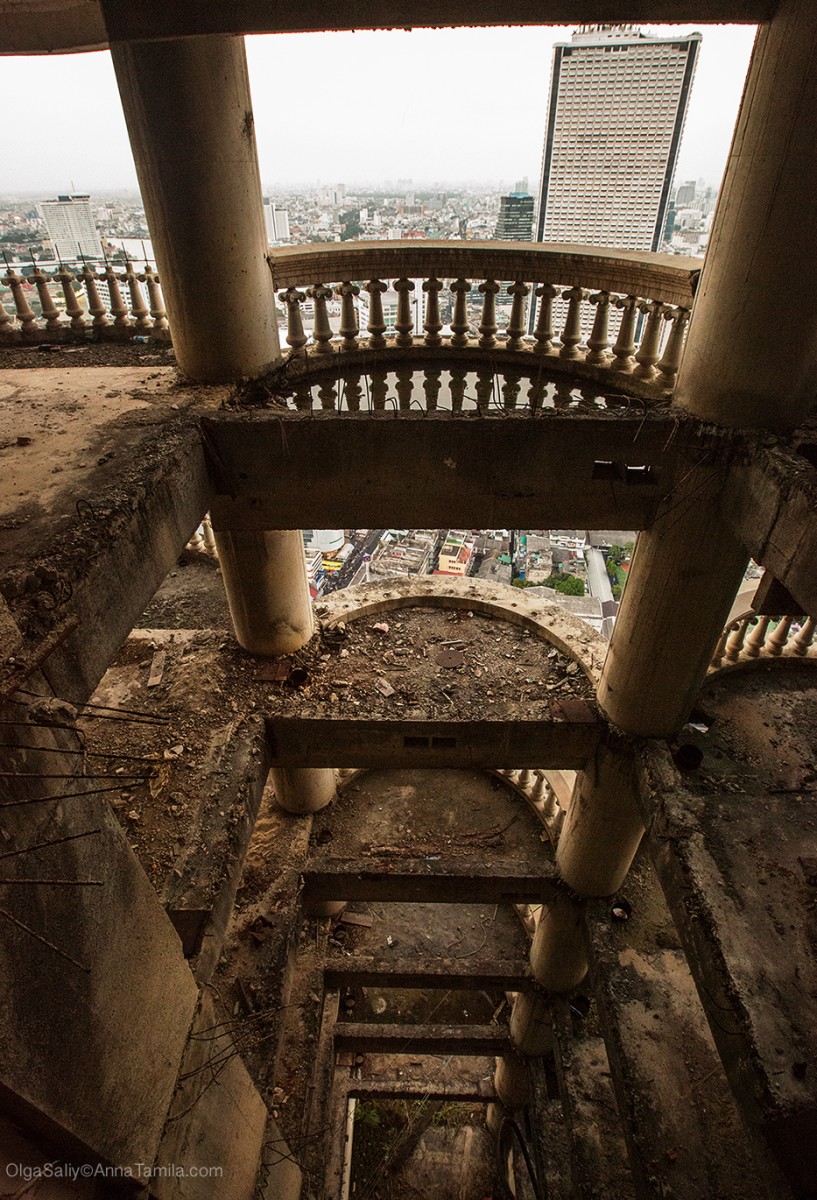 Cuando la obra fue abandonada la torre estaba completa en un 80%. Toda la estructura del edificio, el cableado eléctrico y las cañerías de las primeras 35 plantas, la mayoría de los tabiques y muros internos y la zona comercial estaban finalizados, y sólo restaban quince plantas por terminar. El edificio fue saqueado a conciencia durante los primeros años de abandono pese al empeño de sus propietarios por evitarlo y hoy en día sólo queda la estructura de hormigón armado, cubierta de mugre, hierbajos y agua encharcada, la viva imagen de un desastre post apocalíptico.