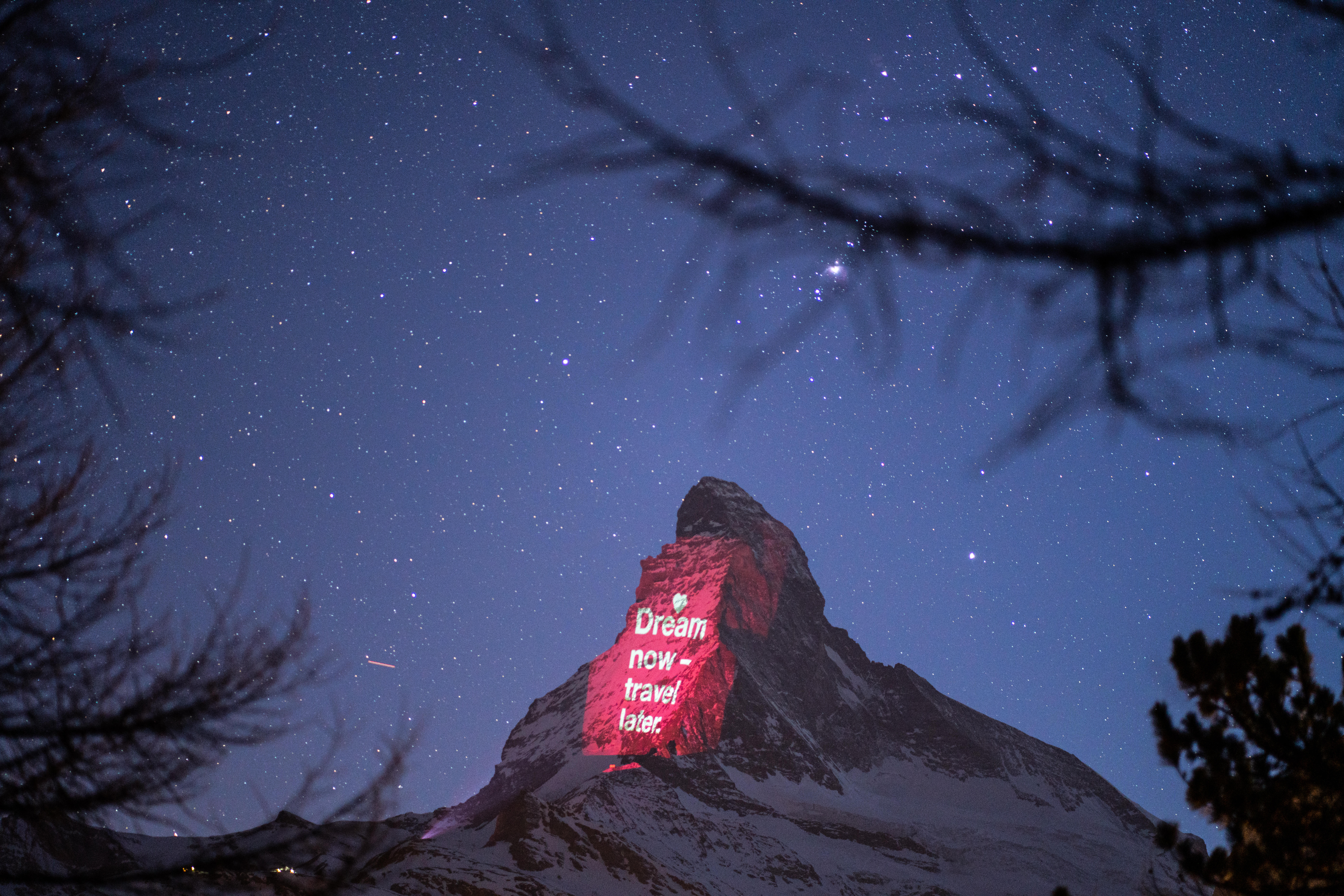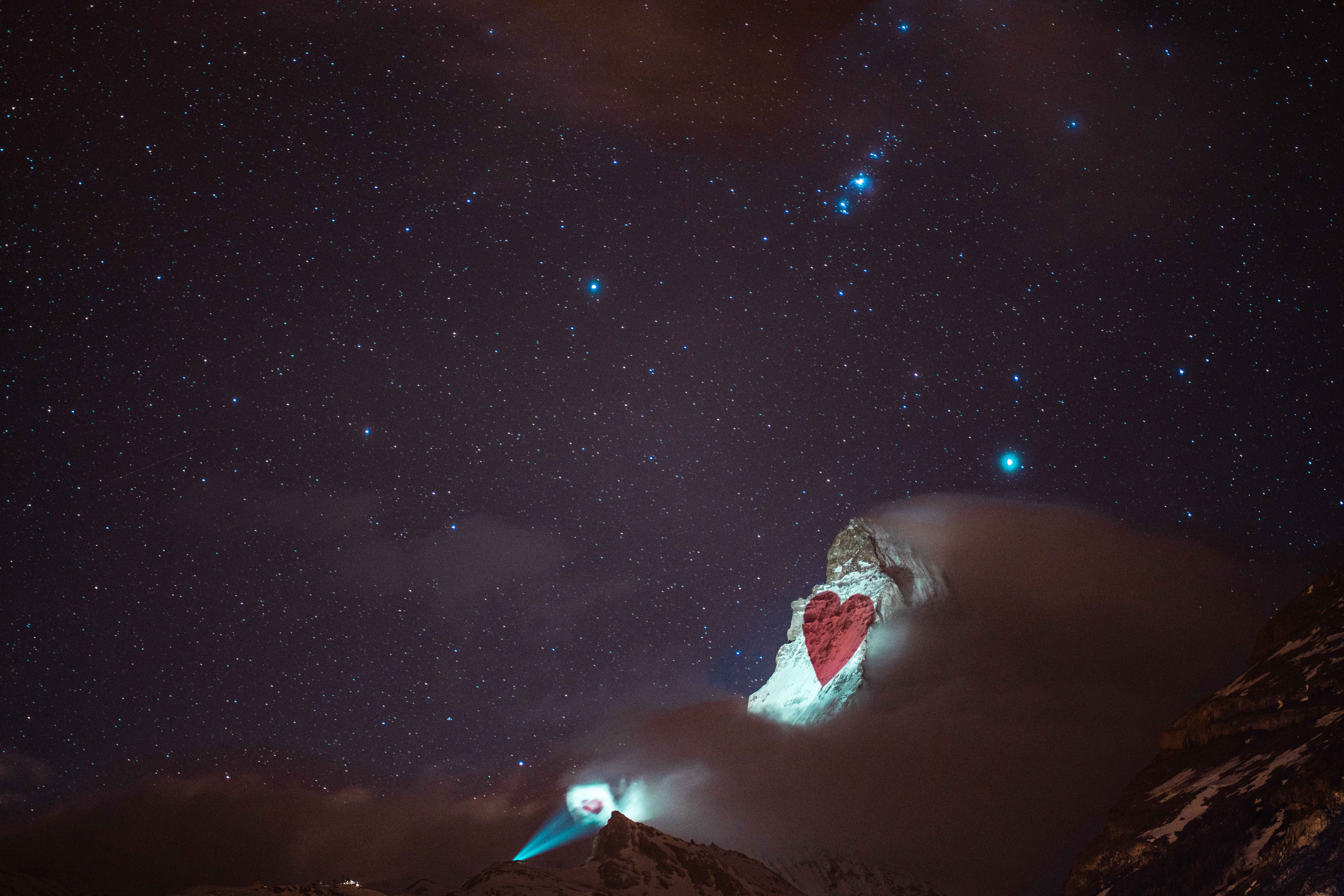 En la frontera entre Suiza e Italia está el Monte Cervino, conocido a menudo por su nombre en alemán: Matterhorn. Con casi 4.500 metros de alto, su silueta piramidal destaca tanto sobre el resto de la cordillera alpina y resulta tan fotogénica que los suizos lo consideran uno de sus símbolos nacionales. A sus pies se encuentra el pueblo de Zermatt, un paraíso para esquiadores y montañeros, que estos días ha decidido promocionarse de una manera muy especial: convirtiendo la cima del Matterhorn en una pantalla de proyección que difunda esperanza al mundo.