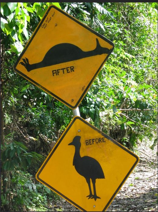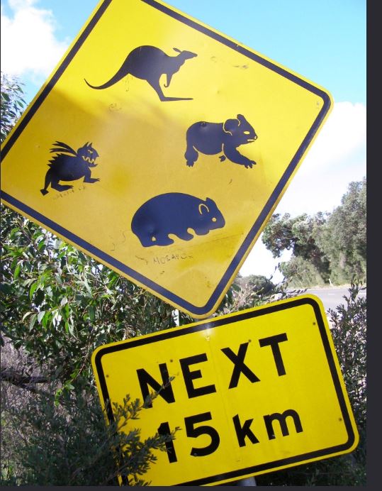La señalización bizarra es una institución en las carreteras australianas, de todas maneras. En un país donde es más probable, por órdenes de magnitud de diferencia, chocarse contra un canguro que contra otro coche, señales de tráfico que en cualquier otro lugar serían probablemente ilegales brotan como setas en mitad del Outback. Dejo aquí una selección para deleite del lector.