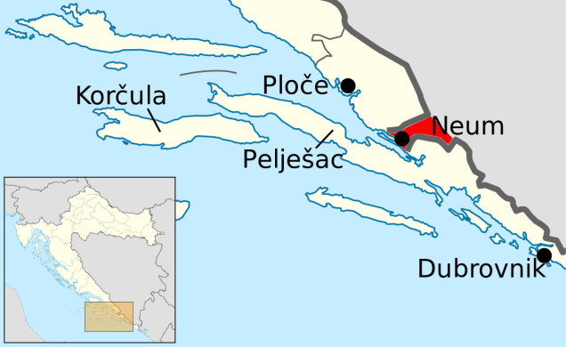 El mapa de Croacia alrededor de Dubrovnik es de una rareza geográfica bastante notable. La ciudad se encuentra en un exclave croata que en su tramo más estrecho tiene apenas un kilómetro de ancho entre el mar y Bosnia. Además el pueblo bosnio de Neum separa la zona del resto de Croacia. El origen de la primera rareza es la compra por parte de Ragusa de la costa dálmata al Imperio Bizantino, allá por el siglo XI. La segunda extravagancia fronteriza tiene un origen aún más curioso que aún la legendaria diplomacia ragusiana con la rivalidad entre repúblicas marítimas. Dubrovnik (que ya se llamaba así en serbocroata) cedió dos territorios a los turcos para separar su propio territorio del de Venecia, y evitar una invasión terrestre. Al sur, el puerto de Herceg Novi, que hoy es montenegrino y separa Croacia de la Bahía de Kotor, y al norte, Neum, que se acabó convirtiendo en la única salida al mar de Bosnia.