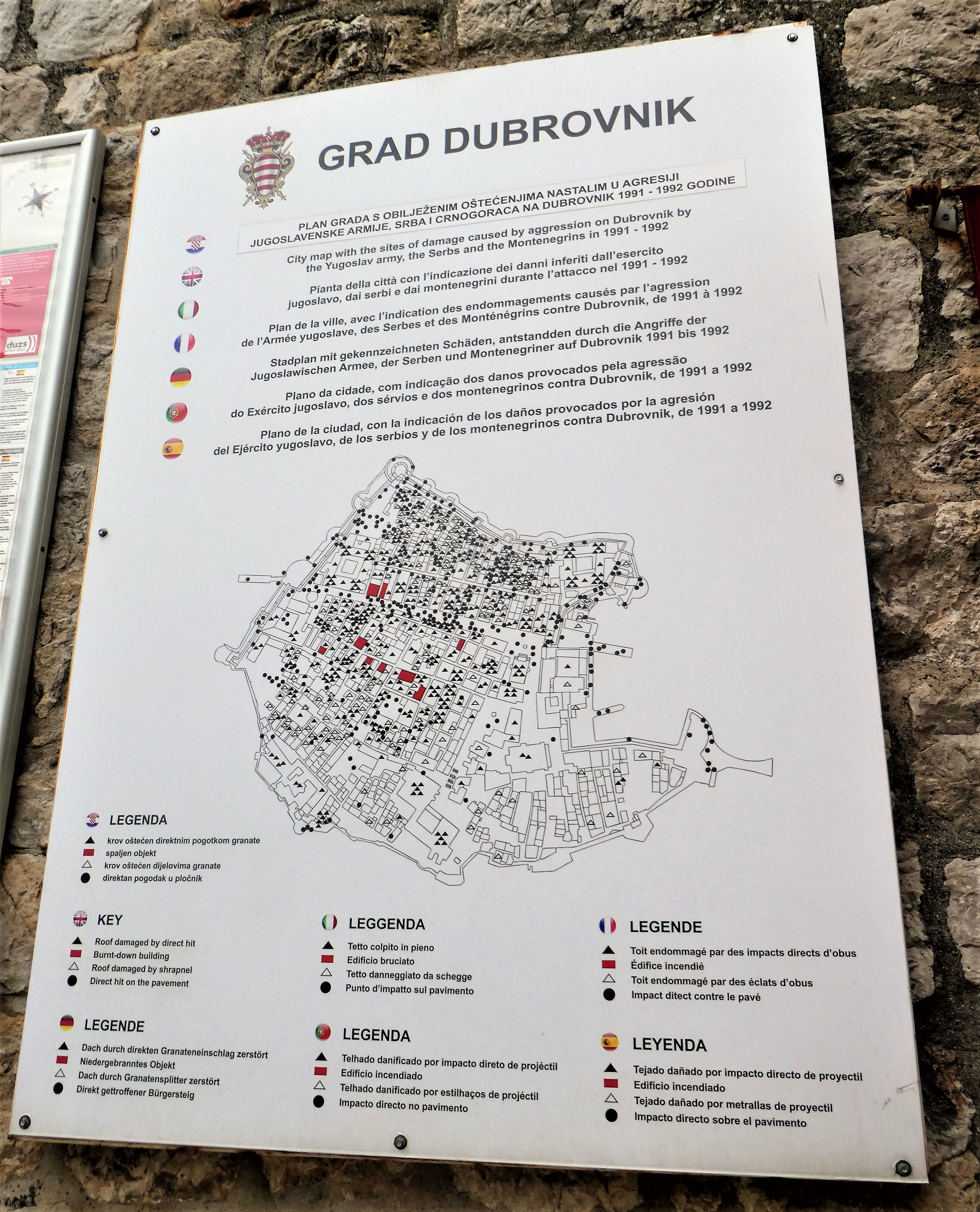 Cartel en las murallas de Dubrovnik explicando los resultados del bombardeo efectuado «por el ejército yugoslavo, los serbios y los montenegrinos» sobre la ciudad. Rencorositos, los croatas.