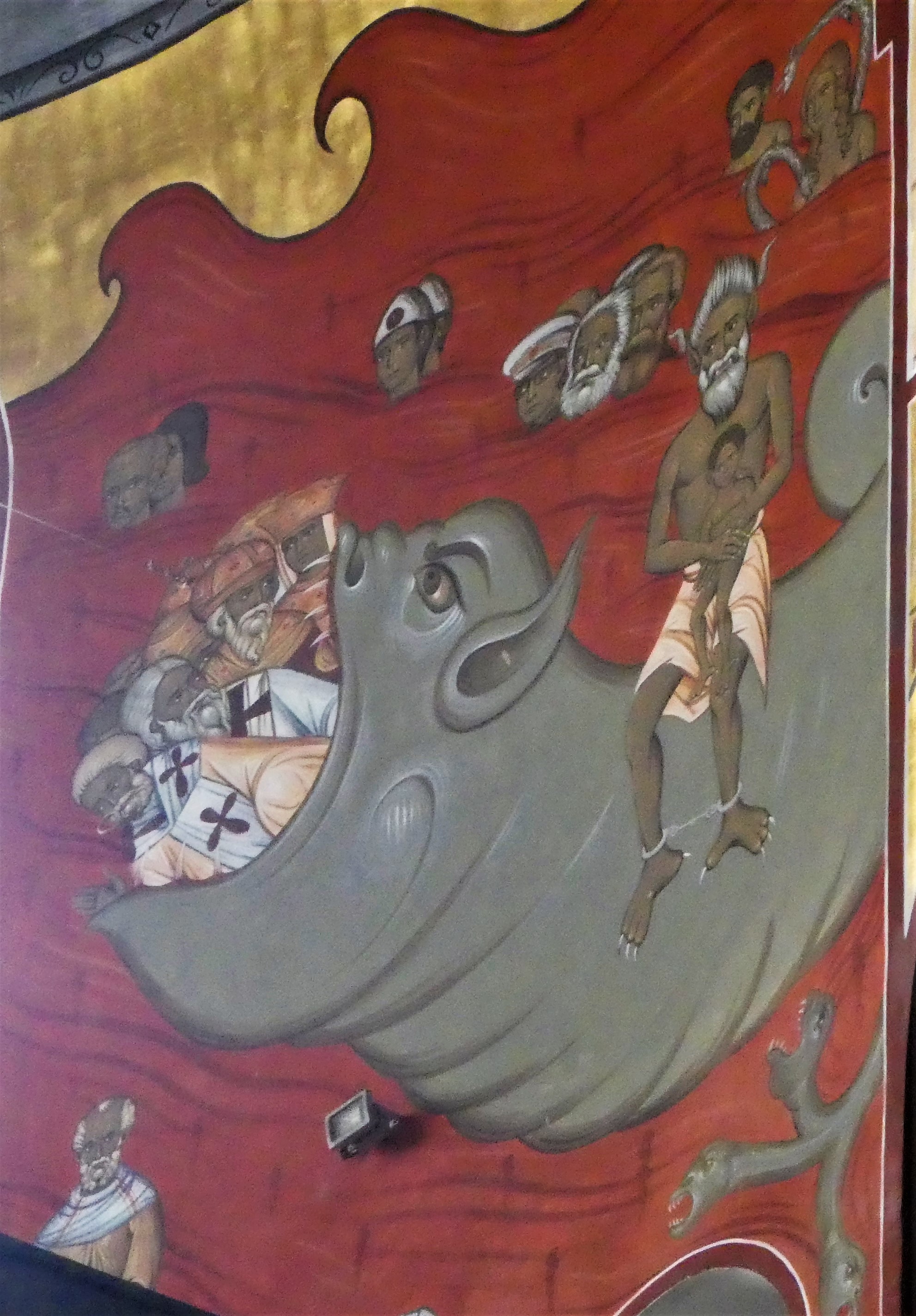 El típico fresco religioso ortodoxo con sus santos, sus sacerdotes, sus monjes, sus monaguillos y, espera, ¿qué?