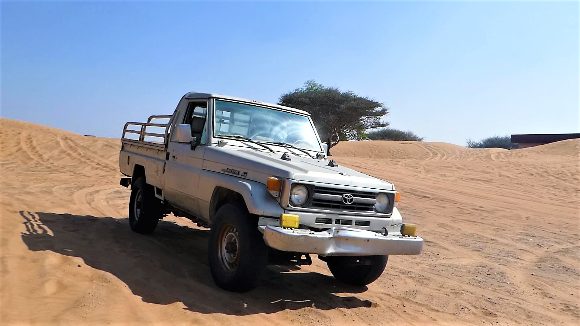 Entablamos una discusión entonces acerca de qué hacer. Javi era partidario de abandonar la visita y regresar al aeropuerto de Abu Dabi, el muy cobarde. Yo, que tengo un larguísimo historial de enfrentamientos victoriosos contra la sensatez, apoyaba la opción de buscar un camino alternativo, eso sí, llevando con nosotros la tabla salvadora. Estuvimos un rato de tira y afloja hasta que una aparición vino a ayudarnos a decidir. Una Toyota pick up hecha cisco, sin matrículas, con más agujeros que un soldado ruso y pinta de haber tomado parte en al menos media docena de guerras africanas se detuvo a nuestro lado levantando un remolino de polvo. Al volante, un tipo enorme con todito el aspecto de haber sido mercenario a sueldo en una fase anterior de su vida, que nos preguntó si teníamos intención de visitar el pueblo fantasma, y se ofreció a llevarnos por 150 dirhams, que después del inevitable tira y afloja quedaron reducidos a 100 (25 euros). Así que una vez más repetimos nuestro mantra; hemos venido a jugar, y nos subimos a la parte trasera de la camioneta.