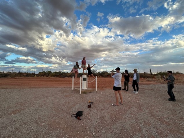 Un par de cientos de personas se habían juntado en el lugar para participar en este acto de locura colectiva. Conocí a unos youtubers italianos que se habían recorrido medio mundo para estar aquí, unos streamers/tiktokers/twitcheros/whatever (no me quedó muy claro) surcoreanos, una pareja sudafricana, un grupo de polacos, y también viajeros de casi cualquier rincón de Australia. Durante el día había una sensación de aplatanamiento, en buena parte debida a los 46 grados que llegó a marcar el termómetro, pero al ocultarse el sol, y con la ayuda extra de un leve sirimiri que nos sentó como maná literalmente caído del cielo, procedimos a juntarnos alrededor de la tienda/pub/gasolinera. Había un ambiente muy agradable de gente compartiendo su historia. Se repartieron pulseras fluorescentes y mí me acabaron liando para que echara una mano colocando un foco enganchado a un generador junto al pilón fronterizo.