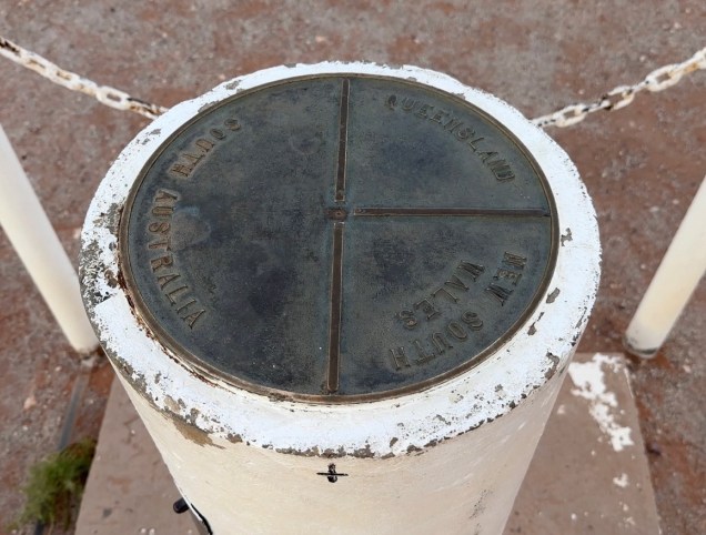 Desde hacía un par de años teníamos planeada una de esas aventuras que debe estar en la lista de todas las personas obsesionadas con fronteras, cambios horarios y, en definitiva, todos esos inventos humanos que dividen tierras de modo en ocasiones bastante alocado. Cameron Corner es el trifinio que comparten los estados australianos de Nueva Gales del Sur, Queensland y Australia Meridional. De este lugar en medio de la nada ya habló Diego en este mismo blog en mucho mejor de lo que lo pueda hacer yo. Australia es un país de zonas horarias que van de lo curioso a lo estrafalario, donde ocurren cosas como que 200 habitantes entre Australia Meridional y Occidental se inventen su propia zona horaria. Por lo tanto, no debe resultar extraño que en el punto de unión de tres estados el tiempo horario sea un concepto un tanto voluble. Durante el horario de verano Nueva Gales del Sur va una hora adelantada sobre Queensland y como no podía ser de otra manera, Australia Meridional está media hora retrasada respecto a Nueva Gales del Sur y medio hora adelantada respecto a Queensland.