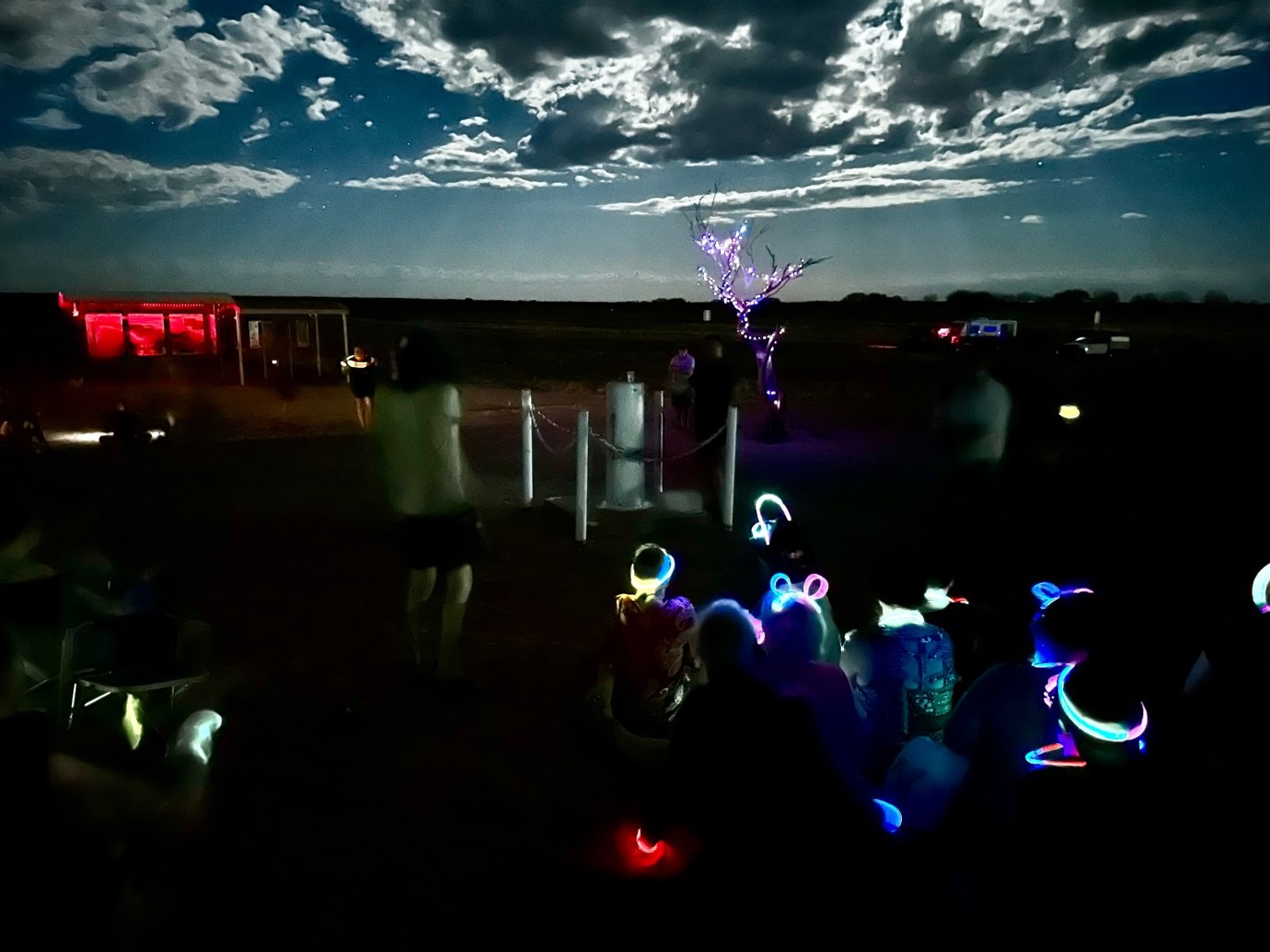 Un par de cientos de personas se habían juntado en el lugar para participar en este acto de locura colectiva. Conocí a unos youtubers italianos que se habían recorrido medio mundo para estar aquí, unos streamers/tiktokers/twitcheros/whatever (no me quedó muy claro) surcoreanos, una pareja sudafricana, un grupo de polacos, y también viajeros de casi cualquier rincón de Australia. Durante el día había una sensación de aplatanamiento, en buena parte debida a los 46 grados que llegó a marcar el termómetro, pero al ocultarse el sol, y con la ayuda extra de un leve sirimiri que nos sentó como maná literalmente caído del cielo, procedimos a juntarnos alrededor de la tienda/pub/gasolinera. Había un ambiente muy agradable de gente compartiendo su historia. Se repartieron pulseras fluorescentes y mí me acabaron liando para que echara una mano colocando un foco enganchado a un generador junto al pilón fronterizo.