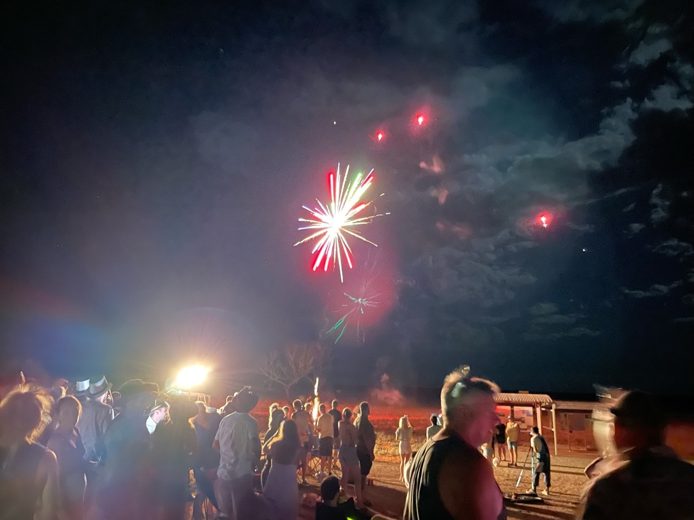 Al llegar la primera medianoche hicimos lo que se espera en estas ocasiones, hubo una cuenta atrás, la gente aplaudió y se abrazó. Incluso se lanzaron algunos fuegos artificiales. Lo que sucedió después ya fue algo diferente a lo que pasa en el resto del mundo: La gente se relajó, anduvimos un par de metros hacia el oeste y esperamos media hora en Australia Meridional. De nuevo hubo una subasta a beneficio del RFDS, otra cuenta atrás, otros besos, otros abrazos y más fuegos artificiales. Y sin que fuera necesaria ninguna instrucción, todos nos movimos un par de metros hacia el este y un poco más al sur para recibir media hora después la tercera Nochevieja en Nueva Gales del Sur. Por supuesto hubo una tercera subasta y después de medianoche (palabra que ya había perdido su significado) hubo más besos, abrazos y unos fuegos artificiales que ya empezaban a ser más efectivos contra los dingos que la dichosa valla.