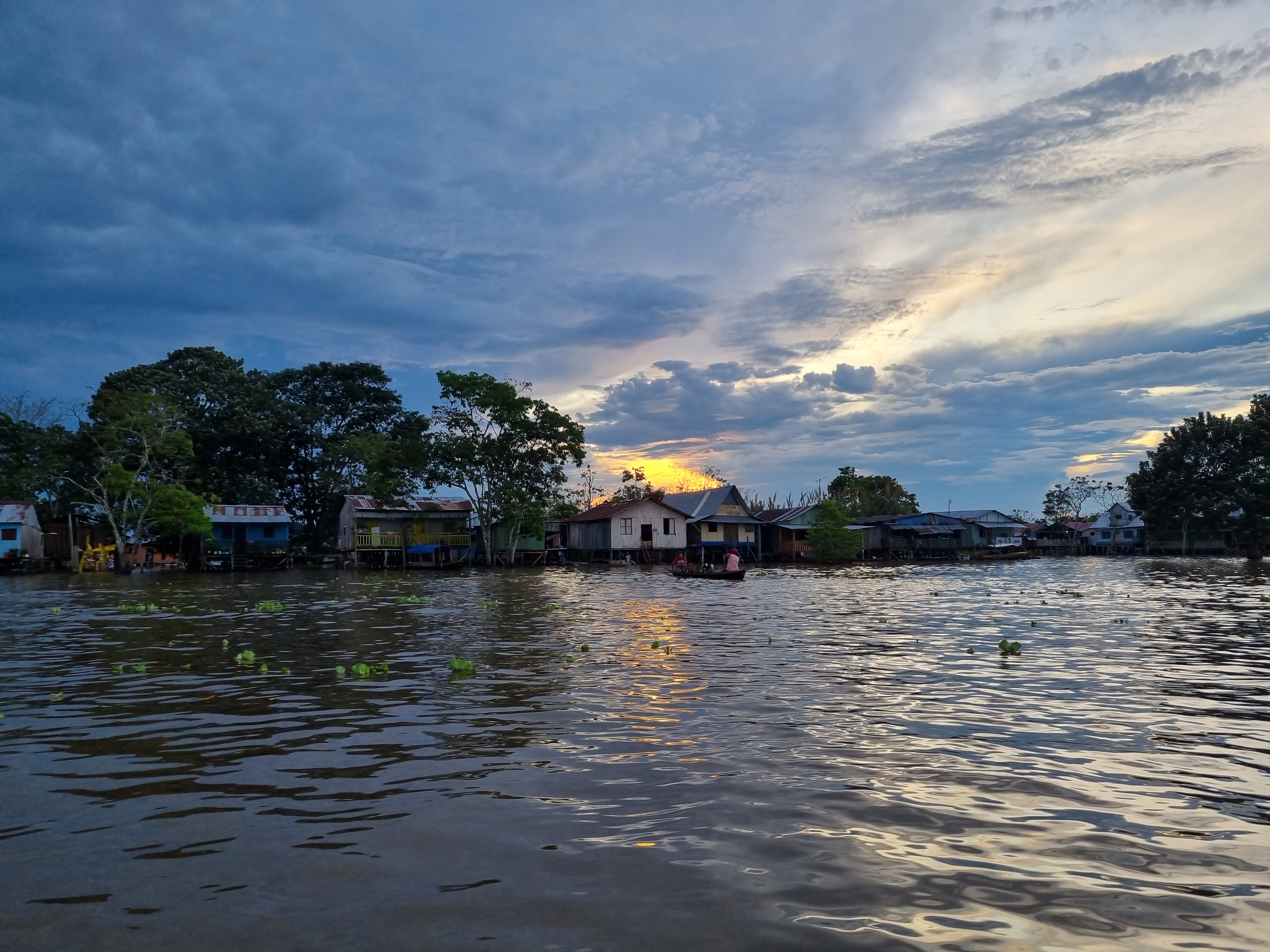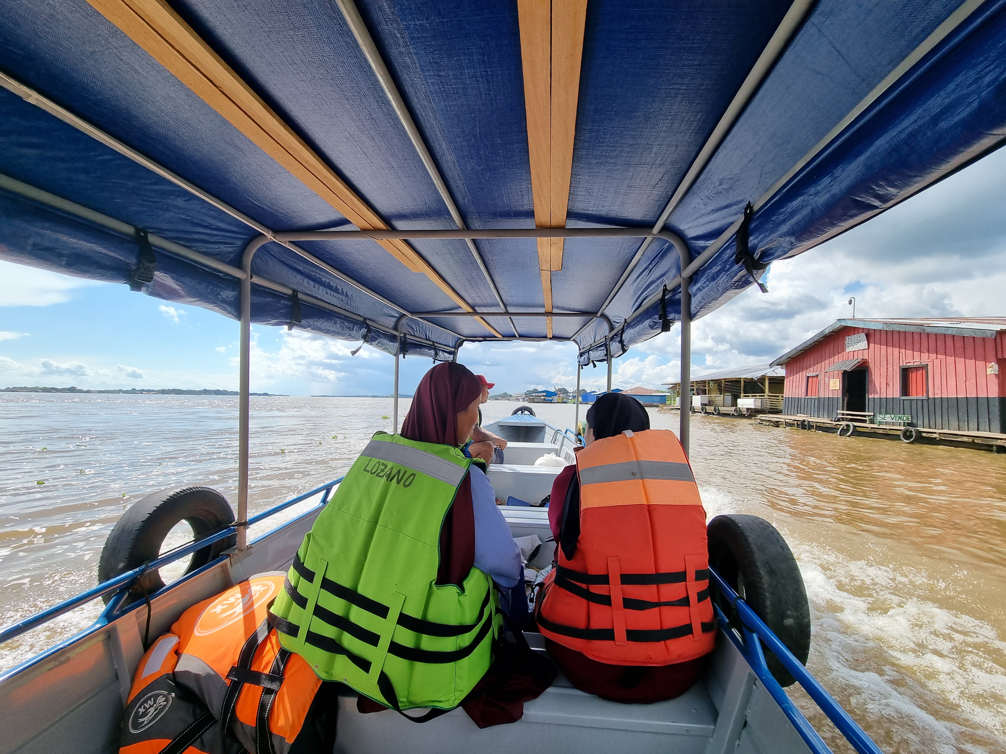 Almorzamos en el mercado, donde la gran mayoría de los comerciantes eran peruanos que vivían de ese lado de la frontera, y descubrí que, a diferencia de la frontera de Brasil con Uruguay, donde el portugués predomina sobre el español, acá era el castellano el que prevalece sobre la lengua de los brasileños. Pagué con pesos colombianos (las tres monedas de los países se aceptan indistintamente en el mercado informal, en esa época a razón de 1 real = 1 sol = 1000 pesos) y bajamos nuevamente al puerto, donde nos ofrecieron transporte en menos tiempo de lo que demoraron en volverse trendic topic los Twingo y los Casio tras el lanzamiento de la sesión de Bizarrap con Shakira. Esta fue nuestra primera interacción de tantas con el río. Las embarcaciones típicas suelen ser super bajitas, dado el escaso oleaje del río, y largas; casi todas son lanchas a motor con un sector que cubre a los pasajeros de los rayos del sol. Junto a nosotros viajaban dos monjas que necesitaban cruzar a la orilla peruana, así que por voluntad de dios (malísimo) terminamos llegando a este país un poco antes de lo previsto luego de regatear el costo del cruce. Navegando por el río es muy difícil distinguir el punto donde la orilla brasileña da lugar a colombiana; de hecho sólo se nota porque cambian los banderines que ostentan muchos de los habitantes de las cientos de casas flotantes.