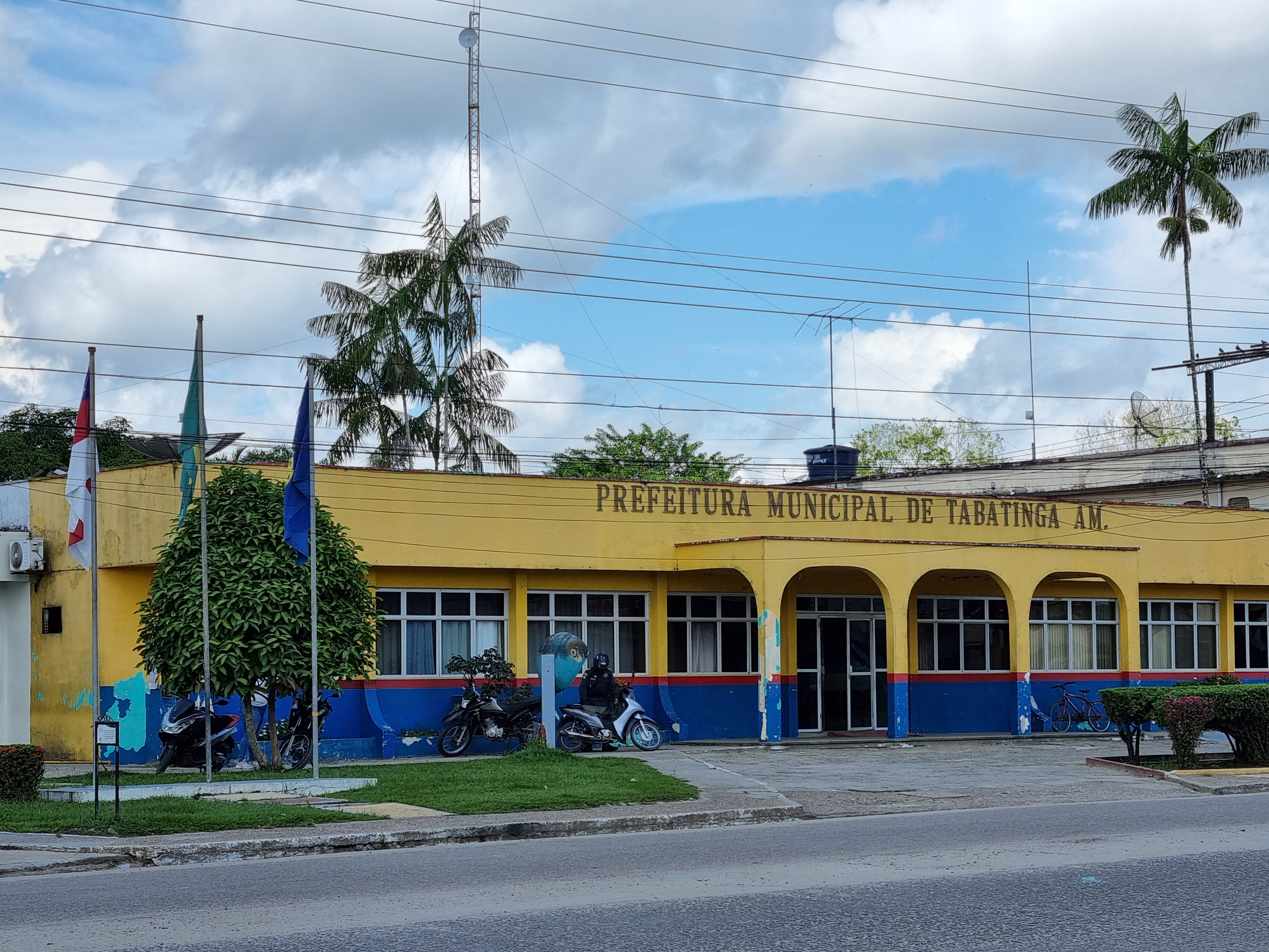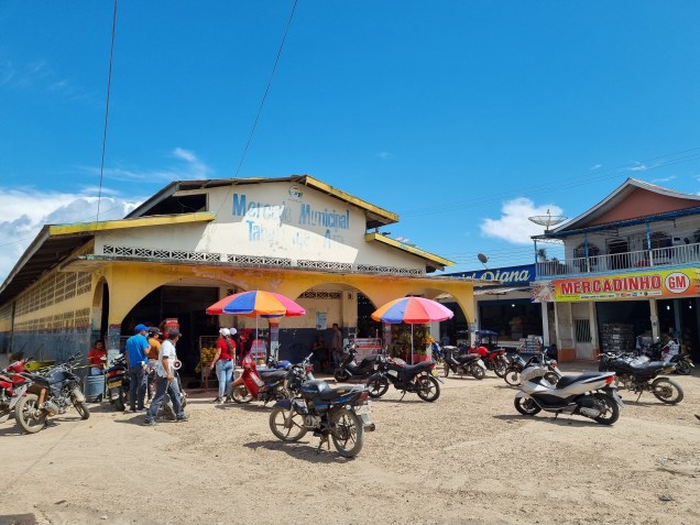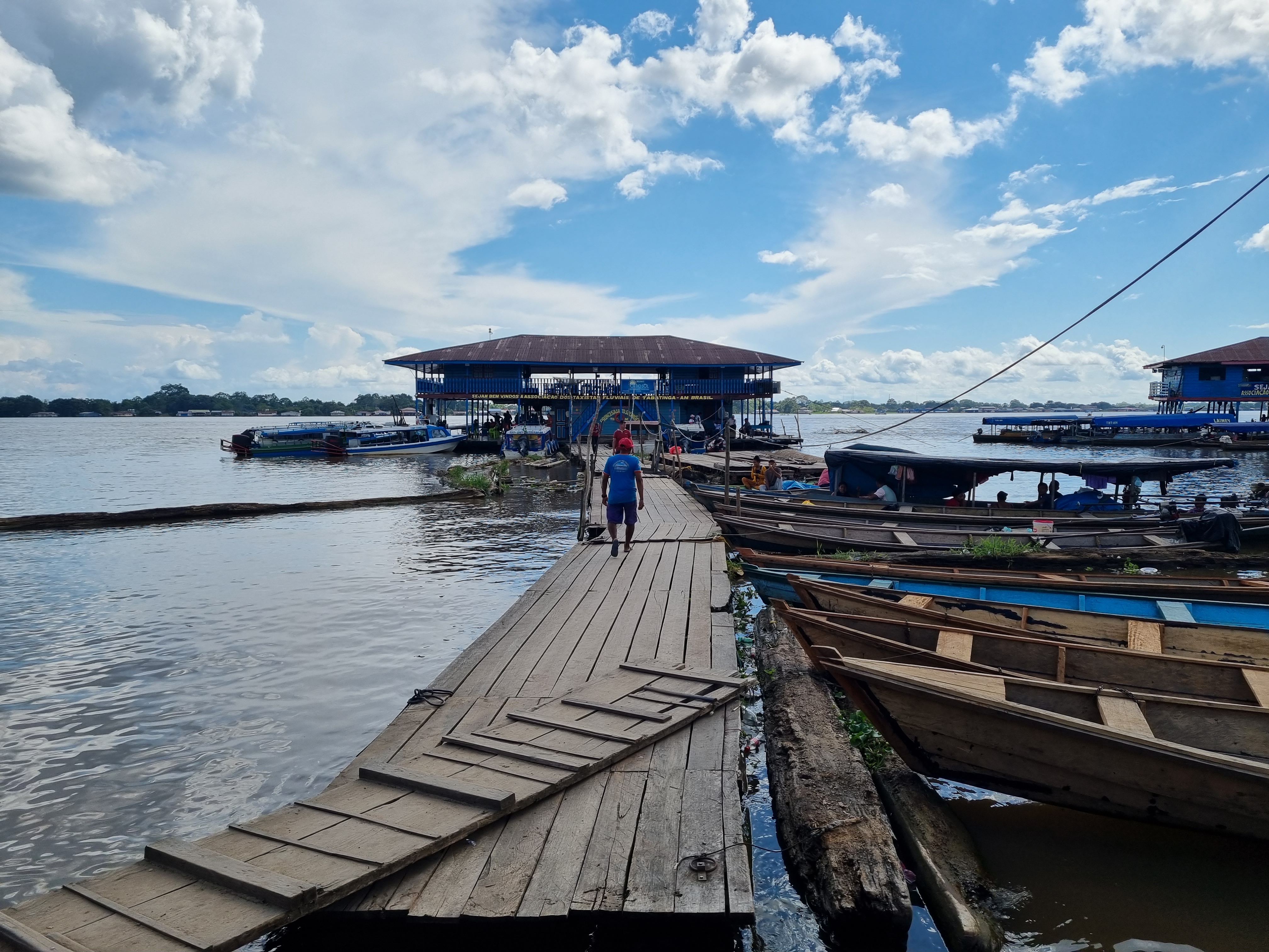 En las primeras dos cuadras hay muchos comercios, que generan un ambiente que me recuerda mucho a lo que vi toda mi vida en Chuy/Chuí y Rivera/Santana do Livramento en el límite con Uruguay, a tan sólo 3.700 km de allí. Esto es: supermercados mayoristas con carteles bilingües, con especial énfasis en algunos rubros como carnes, pollo, refresco de guaraná, bebidas típicas como la cachaça y dulces típicos, como los bombones Garoto. Entendí que así como hacemos los uruguayos, los que vienen del resto de Colombia por turismo también tienen fascinación por estas cosas. Más allá hay algunos bares que por la noche atraen con las clásicas caipirinhas y demás tragos. Tabatinga resultó ser una ciudad con mucho menos movimiento que su vecina y se veía mucho más descuidada, tanto en las construcciones como en sus calles (las secundarias eran casi todas de tierra y estaban en muy mal estado, mientras que en Leticia la mayoría estaban hechas de concreto –hormigón-), con muy pocos árboles para protegerse del sol casi ecuatorial. Visitamos un par de edificios públicos y una iglesia y luego enfilamos en dirección al río hasta llegar al puerto fluvial que era, de nuevo, una enorme casa flotante con muelles improvisados de madera.