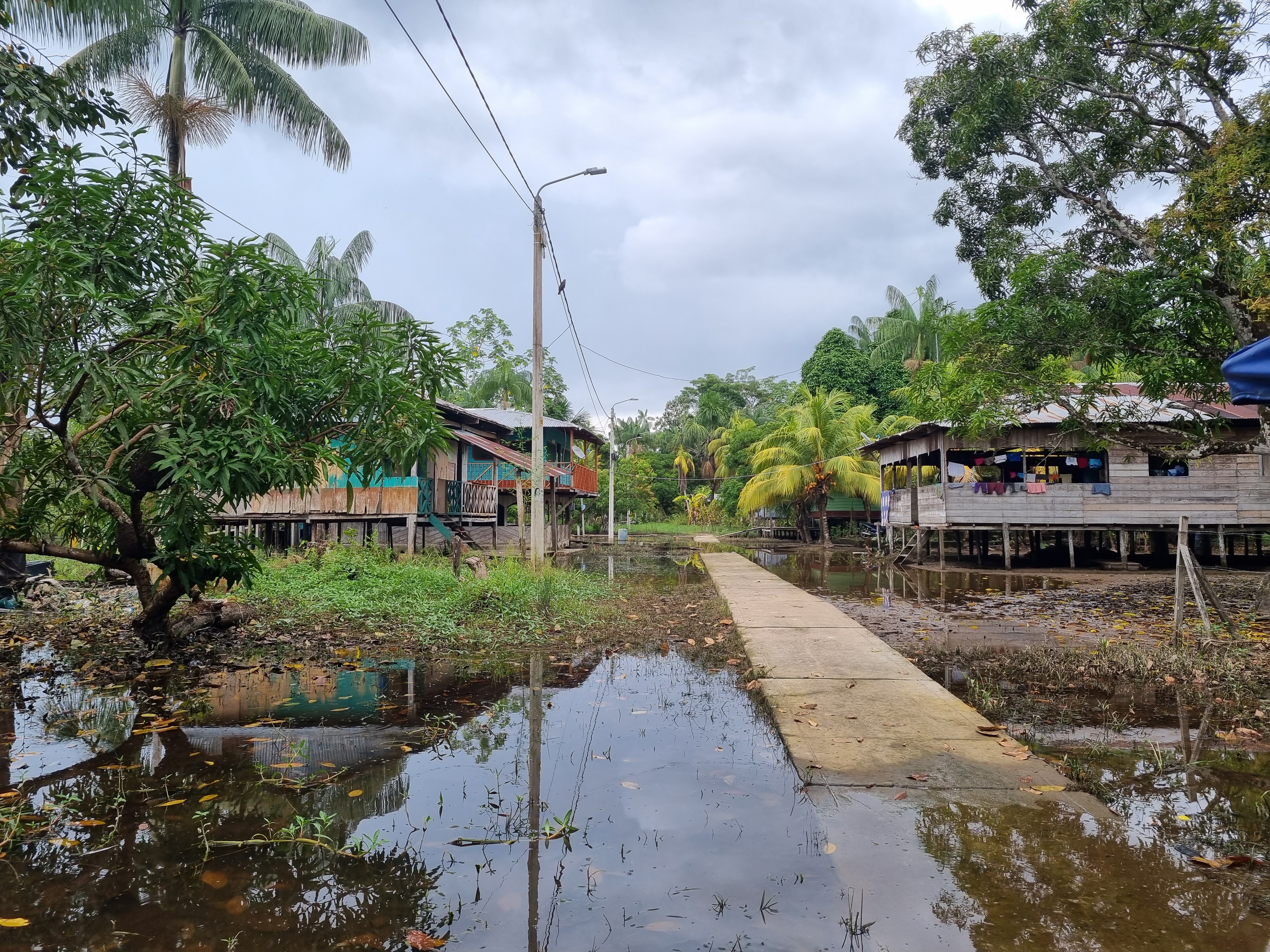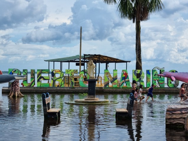 Aprovechamos la tarde para recorrer de punta a otra el pueblo y adentrarnos en algunas de las calles inundadas. En cada una de ellas los vecinos han construido con planificación toda una sucesión de puentes de madera, de una o dos tablas de ancho, y por las cuales idealmente sólo puede pasar una persona a la vez. De algunos de los palos quedan amarradas varias canoas. A medida que avanzamos, el terreno inundado refleja el celeste del cielo y las nubes negras que amenazan con lluvia, lo que le da al paisaje un encanto fotogénico inigualable. En muchas de las casitas hay ancianos sentados, que no dudan en devolver el saludo y sonreír ante nuestra presencia. Son ya las cinco de la tarde, por lo que hay bastante movimiento dentro de la única escuela de la zona, a la que ingresamos para ver a decenas de padres y niños corriendo por los pasillos. De los grifos de la escuela tampoco salía agua. Luego de recorrer, embarcamos nuevamente hacia Leticia, no sin antes pedirle al barquero que se detenga en el medio del cauce para tomarnos fotos y disfrutar de una vista desde el punto donde confluyen los tres países. Una vez que se apagó el motor vino a mí una sensación de paz enorme. El sol iba tiñendo las nubes y, salvo alguna brisa y el lejano ruido de otra embarcación, el Amazonas emanaba un silencio brutal. A mi alrededor, la sociedad del agua se iba preparando para el final de otra jornada, ajena a mi presencia y también a los límites que unos burócratas trazaron muchos años atrás entre cuatro paredes.