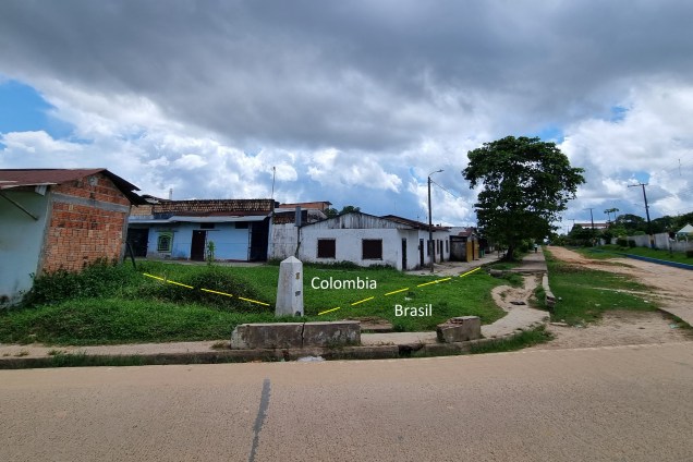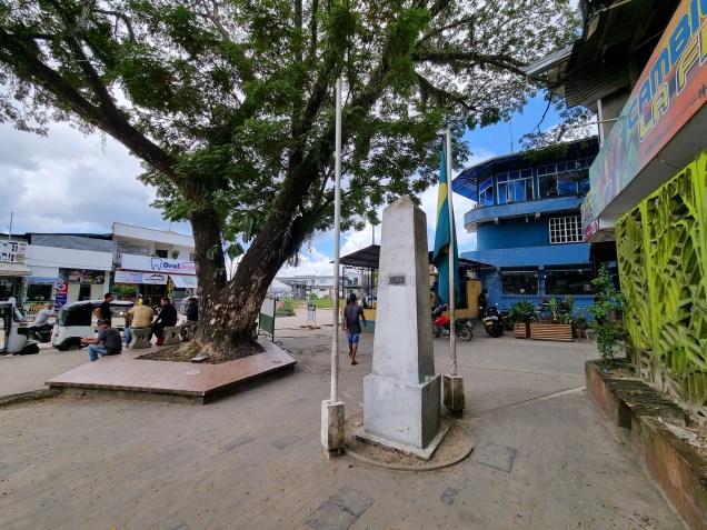 El puerto fluvial de Leticia, es una enorme y caótica sucesión de muelles flotantes y canoas, con personas y mercadería circulando. Aquí entendí otra de las características de la región amazónica: durante la época lluviosa -en la que estábamos- el nivel del río sube hasta dos o tres metros. Entre estación y estación, la costa puede avanzar o retroceder cientos de metros. Frente al río se encuentra un gran mercado donde los comerciantes venden varias especies de pescado -entre ellas, piraña- y de frutas, que en un 70% resultaban exóticas para un uruguayo como yo. Desde allí nos dirigimos a la frontera. A Brasil se llega a través de la Carrera 6. El cruce con la Calle 3 es la última esquina de Colombia, y allí se alzan letreros indicando la frontera y un enorme mojón limítrofe de dos metros que indica el final de un país y el principio del otro. En el suelo hay una línea que parece indicar claramente por dónde corre el límite, como para que no quepan dudas. Del lado colombiano hay una casa de cambio, que con mucha creatividad le han puesto de nombre La Frontera, pero no termina allí la diversión. Las ventanillas dan hacia Brasil y el mostrador está prácticamente sobre el límite, por lo que en los hechos hay que cambiar de país para cambiar moneda, o visto de otra forma, los brasileños pueden cambiar moneda en Colombia sin salir de su país, tan sólo metiendo las manos. Nos tomamos fotos con el cartel que reza “Frontera Colombia – Brasil”, que simboliza el único paso terrestre oficial entre ambos países, y nos internamos en el gigante del sur.