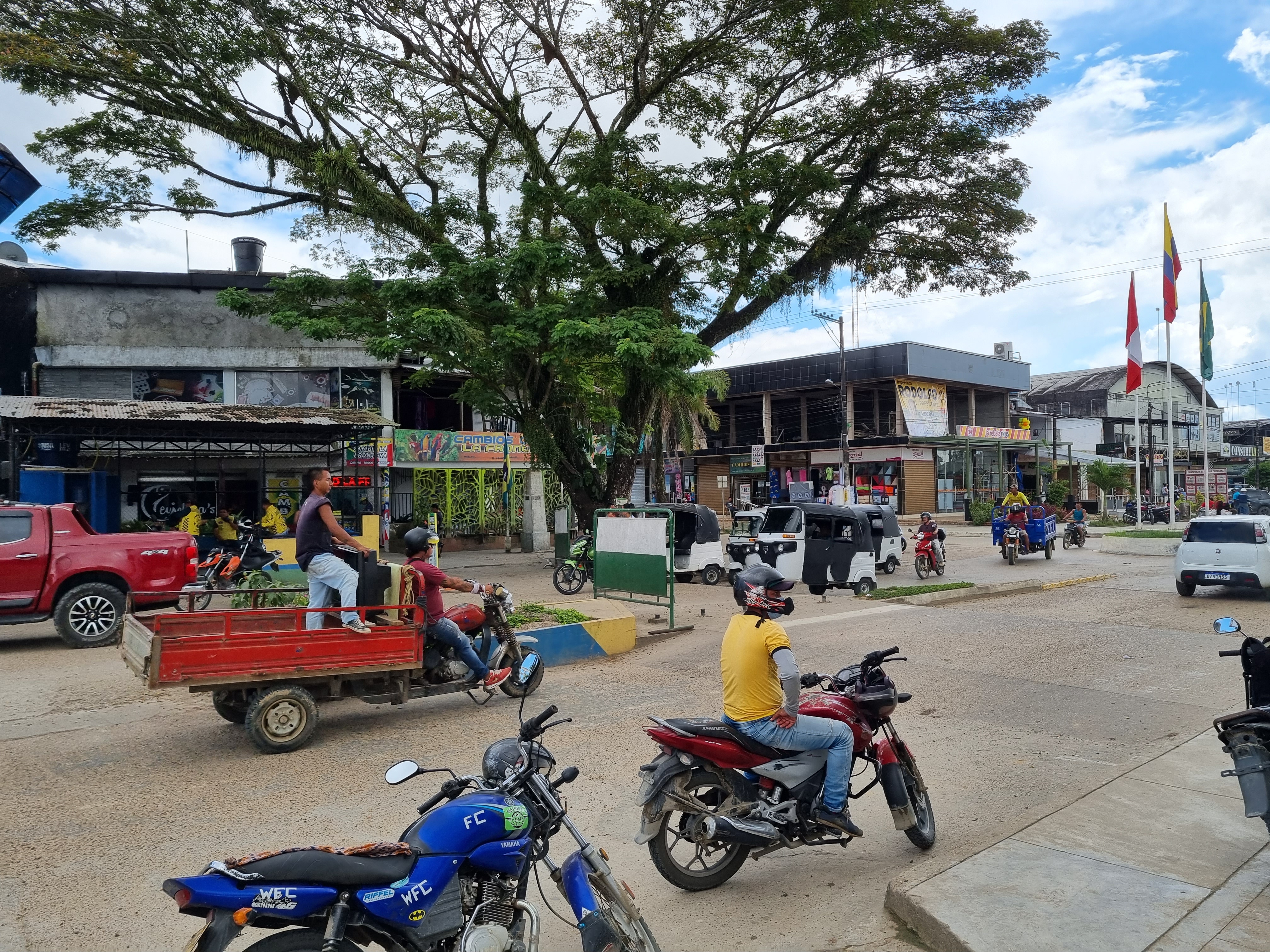 En un momento el chófer entró por una calle oscura y con el pavimento destrozado. Tras parar frente a un basural el hombre bajó rápidamente; no tengo prejuicios contra este país pero por un momento dudé si caeríamos en uno de esos secuestros de las películas. En realidad estábamos en la puerta del hostel y el buen hombre sólo quería ayudarnos con el equipaje. Tras hacer el checkin intentamos conectarnos a la wifi del establecimiento y fue lo mismo que la nada. Es otro problema típico de la zona: no hay conexiones terrestres y las comunicaciones se realizan por vía satelital, así que las velocidades son lentas y el servicio nulo en horas pico. Resignado al mood «no hay wifi, hablen entre ustedes, Sebas y yo nos fuimos a caminar. En seguida nos topamos con un puñado de soldados armados hasta los dientes. Resulta que junto a nuestro hostel estaba la prisión departamental; mientras decidía si esto me traería calma o preocupación caminamos hasta la plaza principal y luego hasta la Calle 8, la vía comercial por excelencia de la ciudad. Allí nos dimos cuenta de los rasgos fronterizos de la ciudad; en los altavoces que daban a la calle convivían ritmos típicamente colombianos como la salsa con los sonidos del tema Tá Rocheda, un forró piseiro típicamente brasileño que estaba de moda en aquel momento y que al día de hoy me sigue transportando mentalmente al lugar.