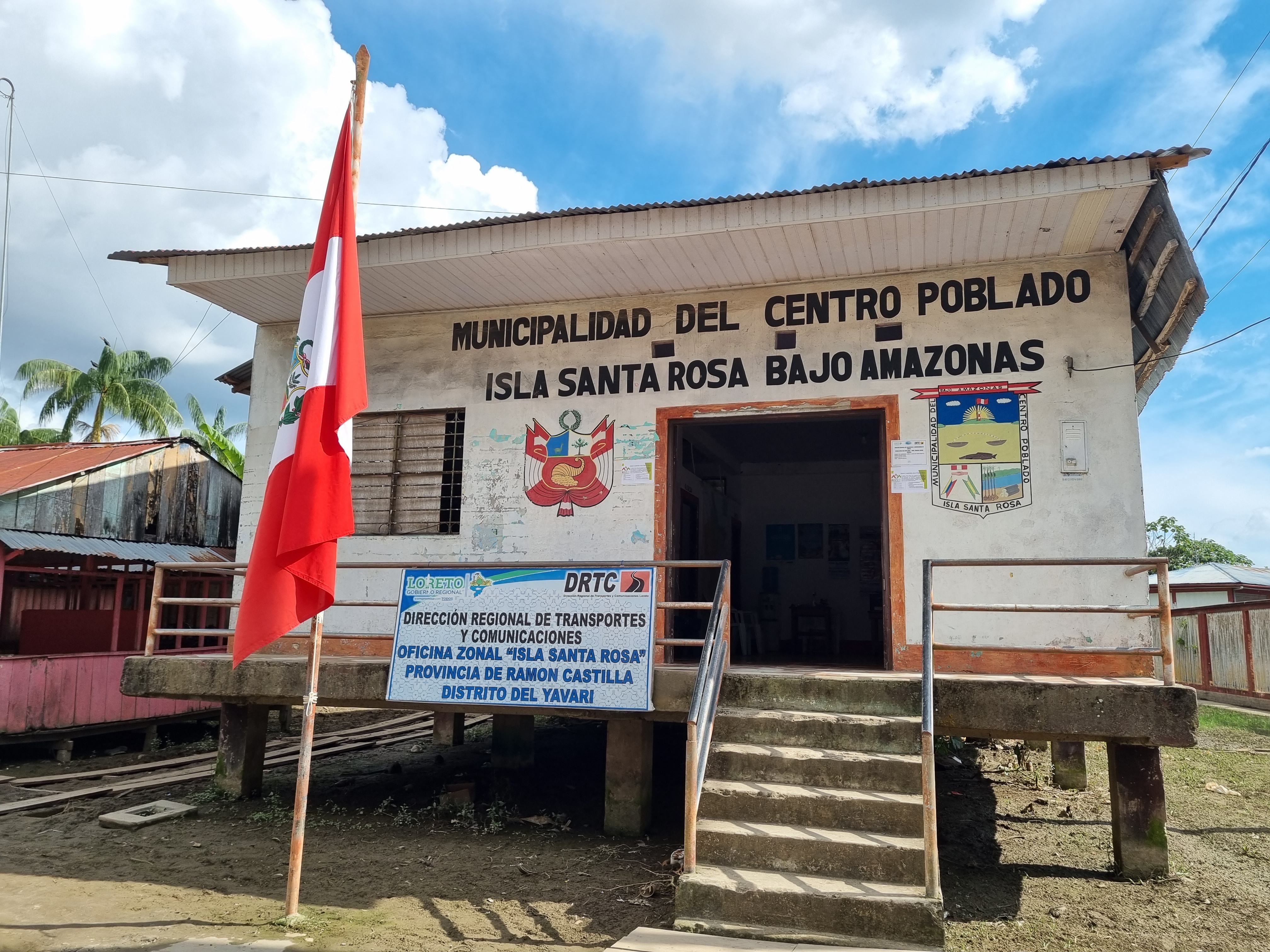 En medio del enorme río Amazonas se encuentra la isla donde se asienta Santa Rosa, que en esa época se encontraba casi completamente bajo agua. Luego de zigzaguear entre un vasto humedal, las casas sostenidas por palos nos anuncian que estamos entrando en el pueblo. La calle principal de Santa Rosa tiene un muro que hace las veces de atracadero. El viajero es recibido por un par de carteles alusivos a que uno se encuentra ya en Perú, una casa de cambio y unos cuantos bares de diverso tamaño. Procedemos a pisar por primera vez, atentos a comenzar con el pie derecho, y nos disponemos a caminar a recorrer la calle. Santa Rosa es una comunidad muy diferente a Leticia y Tabatinga. La economía del lugar parece consistir en la pesca y en menor medida del turismo. Las pizarras de los bares invitan a degustar el pisco peruano y la Inca Kola. Pronto descubrimos que esta calle es de hecho la única que se puede transitar con vehículos (nuevamente, tuktuks) porque todas las demás se han inundado.