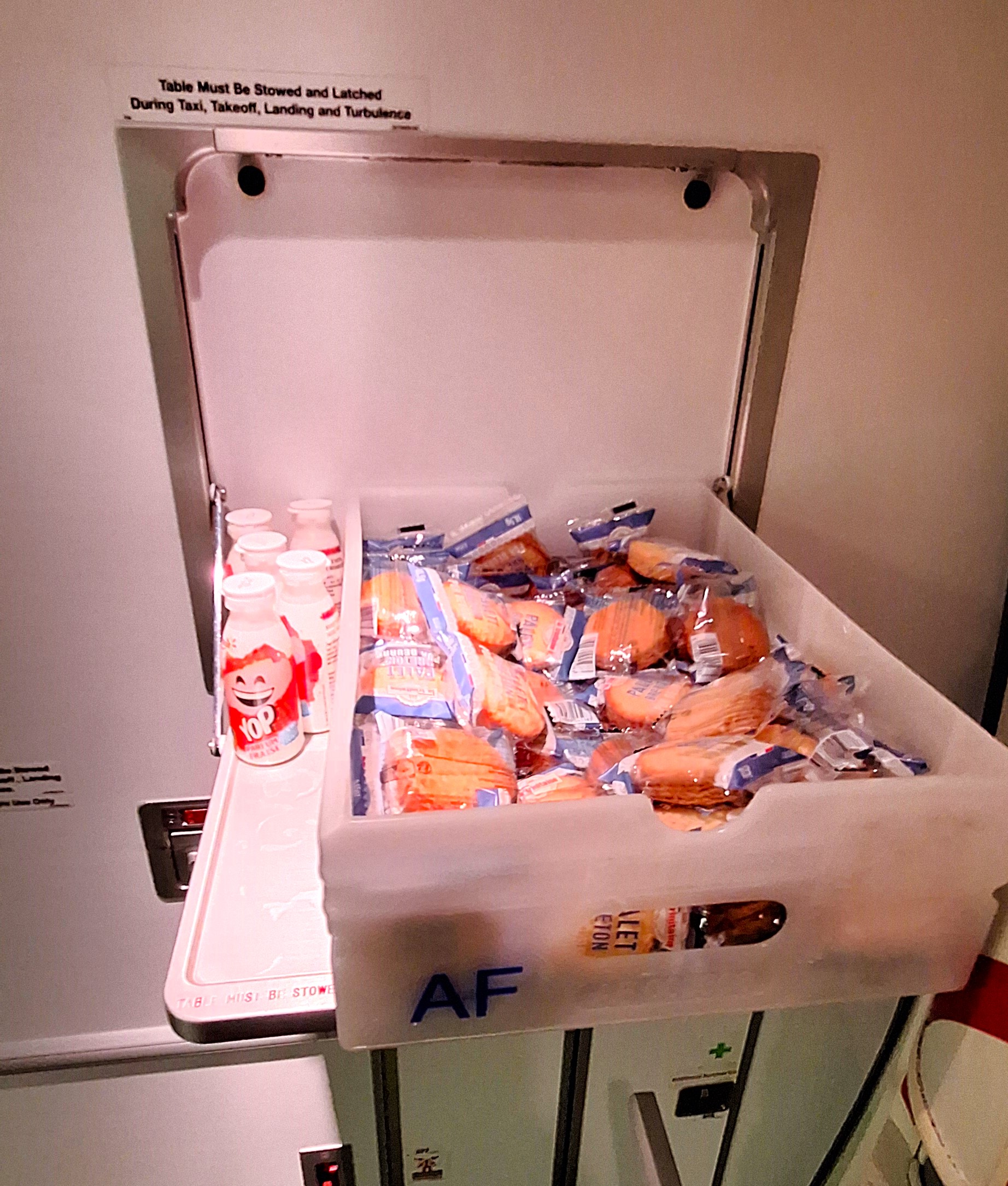 Tanto a la ida como a la vuelta hay dos refrigerios incluidos en el precio del billete. Uno a la hora del despegue y otro una hora antes de aterrizar. Entre medias hay un desierto nutricional de diez horas o más que cada uno sobrelleva como puede. Con 322 pasajeros, dos tercios de ellos en turista, la tripulación no daría abasto para solicitudes de agua y bebidas, así que una vez terminado el reparto de bandejitas se instalan un par de rincones de autoservicio en los galleys con bebidas, sándwiches, galletas y dulces. En ellos se forman pequeños corrillos de perfectos desconocidos charlando de banalidades mientras engullen minúsculos bocadillos de jamón y queso o se sirven zumos y cocacolas. Es la «porción individual de amistad» de El Club de la Lucha, conversaciones en simple english mientras se espera en la cola del baño. Do you want another sandwich? More juice? Is it your first time in Europe? May I get your Insta?