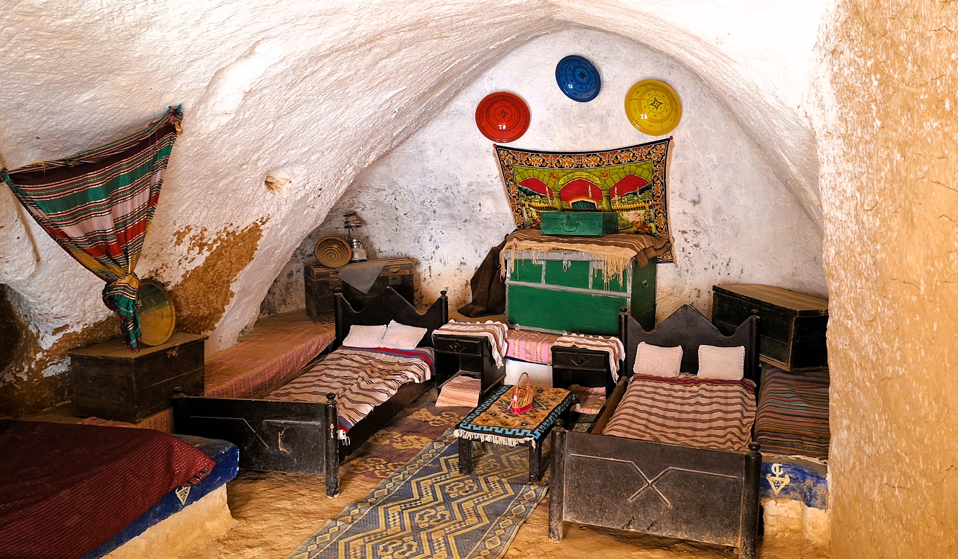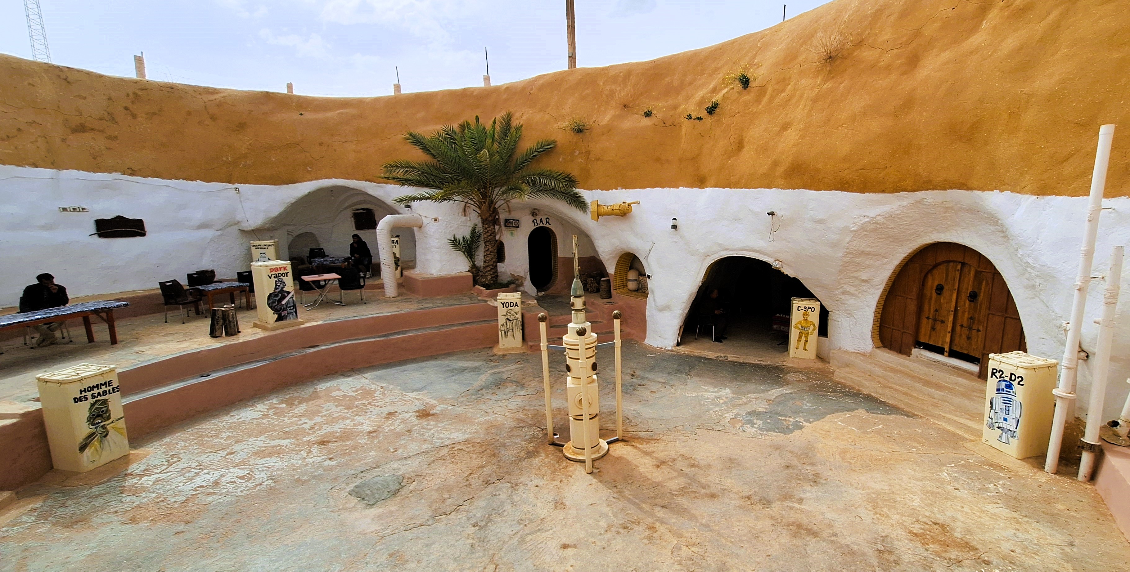 Al Sur de El Jem y su sobrenatural anfiteatro romano comienza el Desierto del Sáhara. La densidad de población de Túnez desciende proporcionalmente a la latitud, hasta llegar a la provincia de Tataouine, que es simultáneamente la más grande y la segunda menos poblada del país. El nombre le resultará familiar al lector a poco que se haya asomado a un cine en el último medio siglo; el ficticio planeta Tatooine es el hogar de Luke Skywalker y de su padre Anakin, más conocido este último por su stage name: Darth Vader. Varias escenas de media docena de películas diferentes de la saga Star Wars fueron rodadas en el Sáhara tunecino, que ofrecía, a diferencia de otros países desérticos de la zona, no sólo paisajes deslumbrantes, sino cierta seguridad y facilidad en la comunicación. Los desiertos argelino y libio no sólo son veinte veces más grandes que el tunecino sino probablemente más espectaculares, pero claro, plántate tú allí con un set de rodaje y varias estrellas de Hollywood.