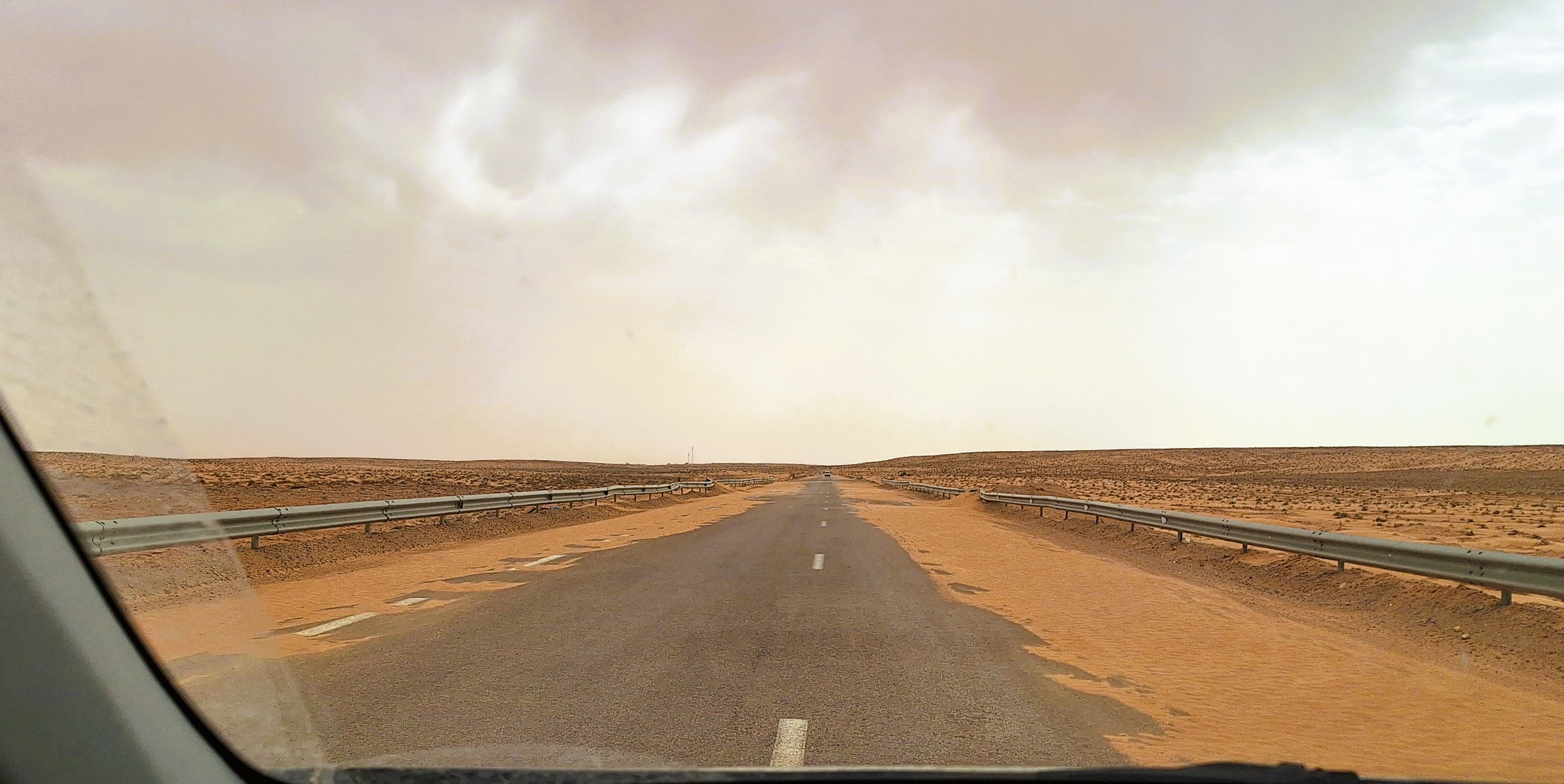 Según avanza la Carretera Transafricana el paisaje va cambiando poco a poco. Los olivares y las ciudades van dejando paso a horizontes cada vez más planos y yermos, hasta que todo lo que abarca la vista desde las ventanillas del coche es una extensión abrumadora de arena tachonada de arbustos y de pilas de neumáticos abandonadas allí por pastores y nómadas como puntos de referencia para encontrar pozos. En el Sur de Túnez hay decenas de kilómetros entre un pueblo y el siguiente, y más vale llevar el tanque de gasolina bien lleno; durante decenas de kilómetros la propia carretera es el único vestigio de civilización.