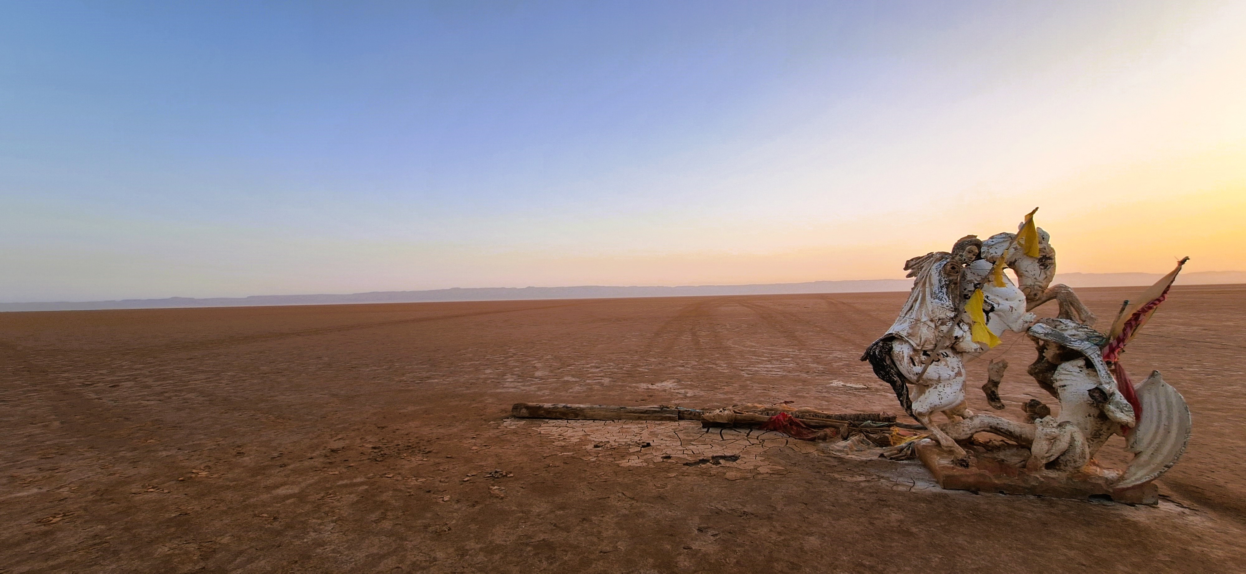 Una escultura hecha de basura y plástico en el lago salado, al amanecer. Yo tampoco sé qué hace ahí