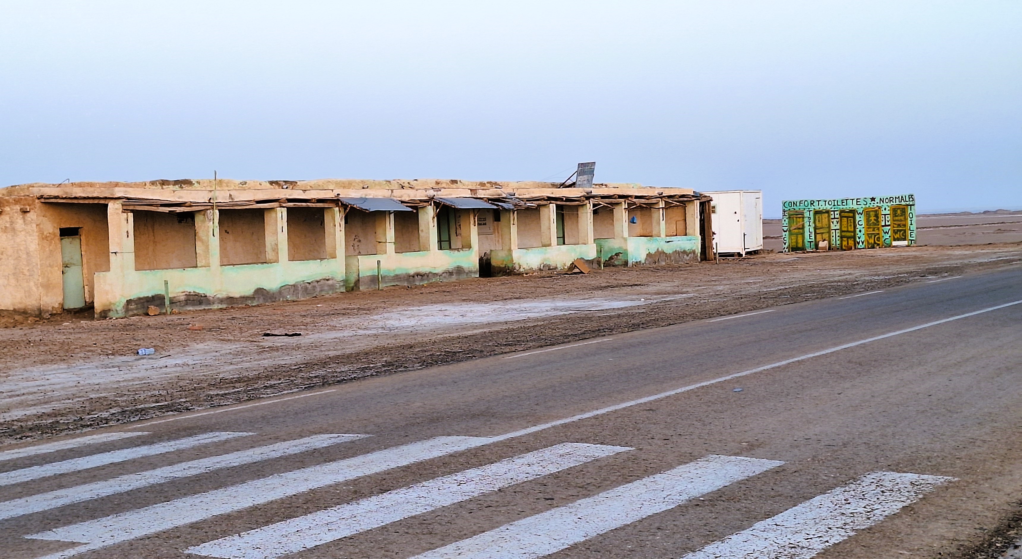 Un bar (cerrado) y unos baños en mitad de la carretera. Los baños en cuestión aparecieron en este vuestro blog fronterizo hace unos años, en la entrada dedicada a los váteres más remotos del mundo. Así que por supuesto hice uso de ellos, en la que fue una de las experiencias más nauseabundas de mi vida: están abandonados y nadie los limpia desde hace mucho