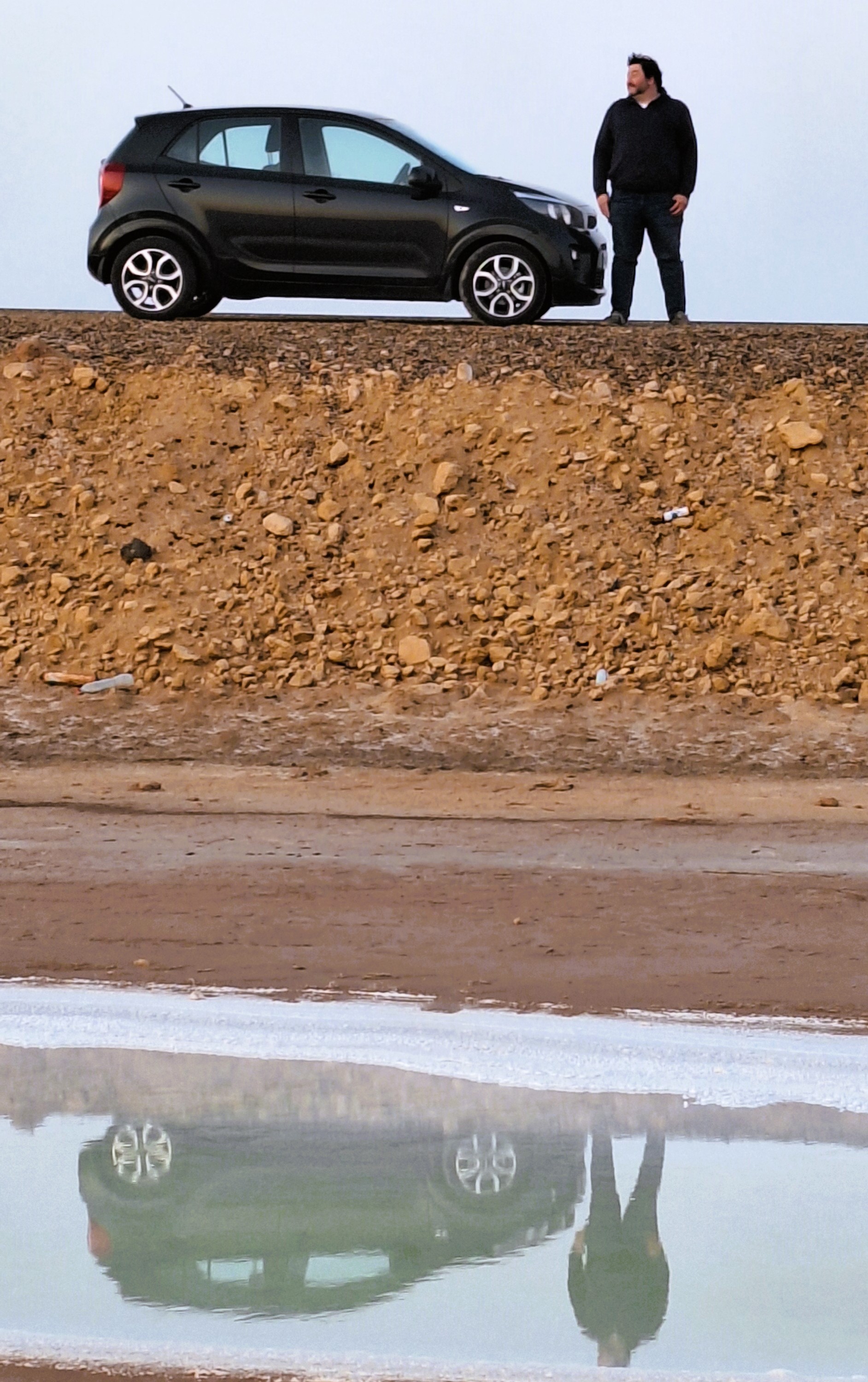Después de repostar en Douz y de cruzar media docena de pueblos polvorientos a la luz de la media tarde llegamos, por fin, al otro gran hito del día: el lago salado de Chott El-Jerd, cinco mil kilómetros cuadrados de lago endorreico en invierno, un secarral el resto del año. En Google Maps aparece como una enorme extensión azul, así que podría esperarse algo de agua, pero es más un enorme salar que un lago. La carretera es una línea recta que empieza y acaba a infinitos kilómetros de cualquier parte, elevada cuatro o cinco metros sobre el agua estancada y generalmente muy maloliente, en la que ocasionalmente se puede encontrar un bar o un puesto de venta de recuerdos, a decenas de kilómetros de la civilización. La planicie infinita del salar sólo se ve interrumpida por las montañas del Parque Nacional de Dghoumes a quince o veinte kilómetros de distancia al norte; avanzando por la carretera al doble de la velocidad permitida dada la ausencia de coches las montañas parecen moverse con nosotros mientras la superficie del lago cruza veloz bajo nuestras ruedas; es un bucle que dura veinticinco minutos, los que tardamos en cruzar por primera vez el paisaje alienígena.