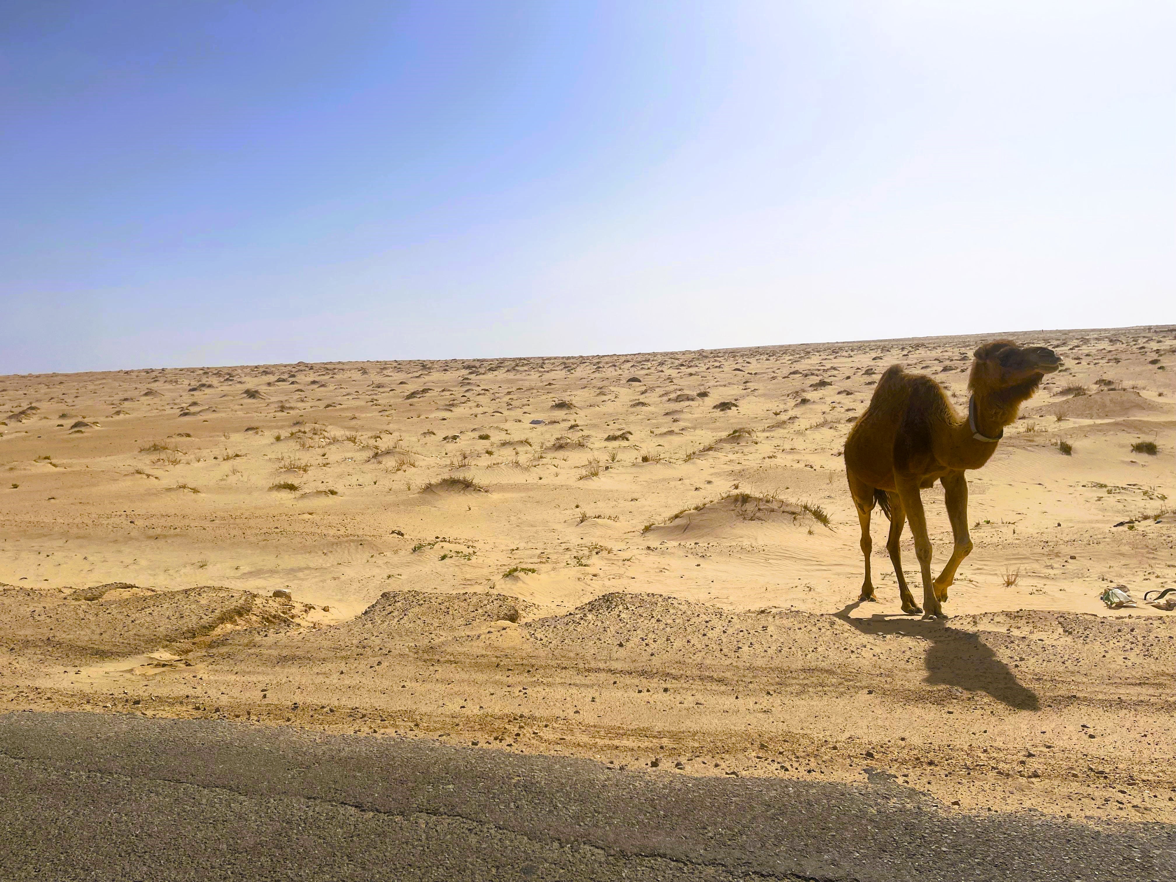 La norma básica de conducción por el desierto, incluso por un desierto civilizado como el de Túnez, es repostar cada vez que sea posible. Salimos de Matmata con el depósito razonablemente lleno, y nos internamos en el Sáhara. Los primeros kilómetros dando requiebros en las colinas dieron paso en seguida a infinitas rectas pobladas únicamente por espejismos, plantas rodadoras y, de vez en cuando, algún pastor con su rebaño o tiendas de campaña de los beduínos nómadas, los únicos pobladores y dueños del desierto en esta parte del país. Fueron noventa kilómetros, poco más de hora y cuarto en total, en los que apenas nos cruzamos con una docena de coches y adelantamos a un par de camiones renqueantes. Pero por suerte para nosotros, viajeros acostumbrados a la comodidad, en ningún momento perdimos la cobertura del móvil ni de Internet. El desierto de Túnez, al menos la parte que nosotros recorrimos, está domesticado, y además de la carretera, la arena y los dromedarios, uno viaja acompañado de cables de alta tensión que unen entre sí antenas de móvil espaciadas cada diez o quince kilómetros.