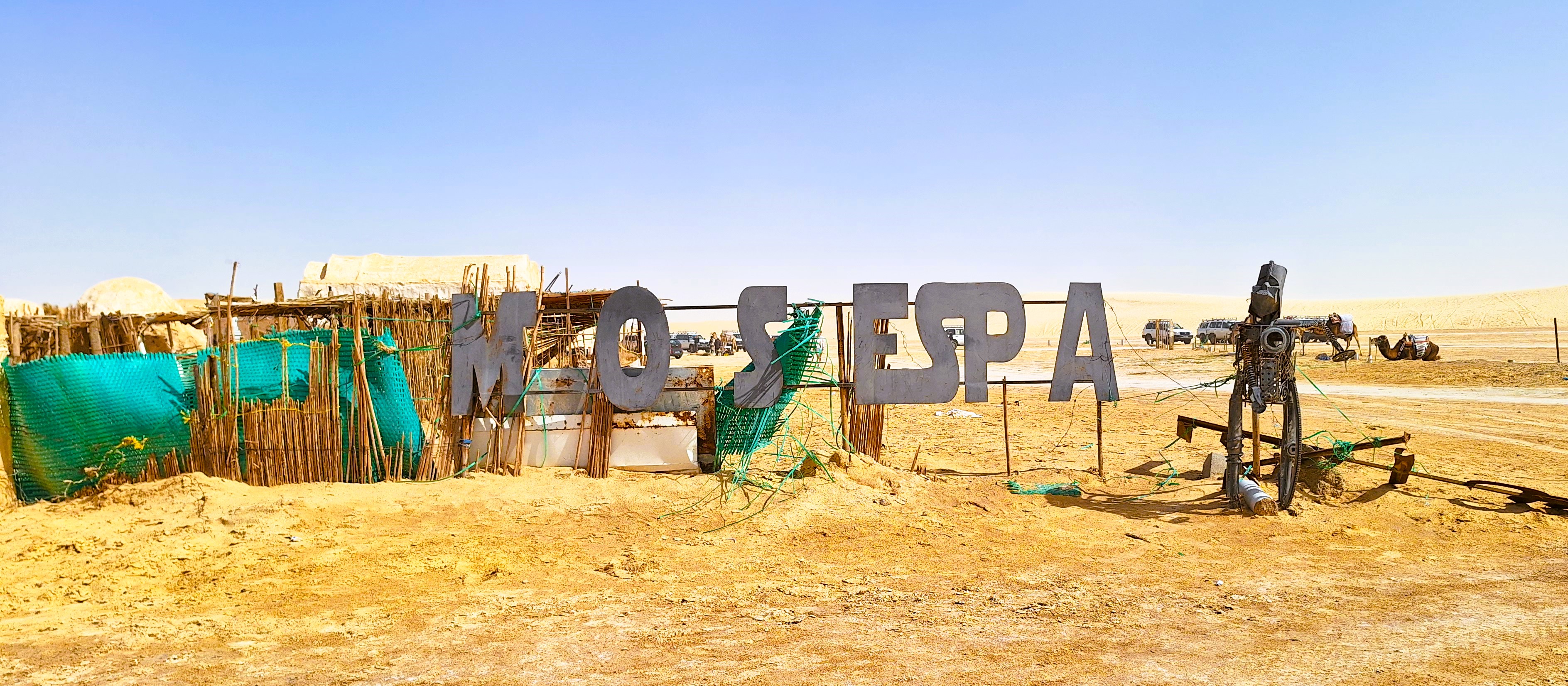 La carretera de Tatooine son quince kilómetros de lámina negra en el desierto. Cuando sopla el viento la arena recorre de lado a lado el asfalto. Pero es perfectamente transitable con cualquier vehículo (los beduínos van y vienen en una de las motos desguazadas que conducen)