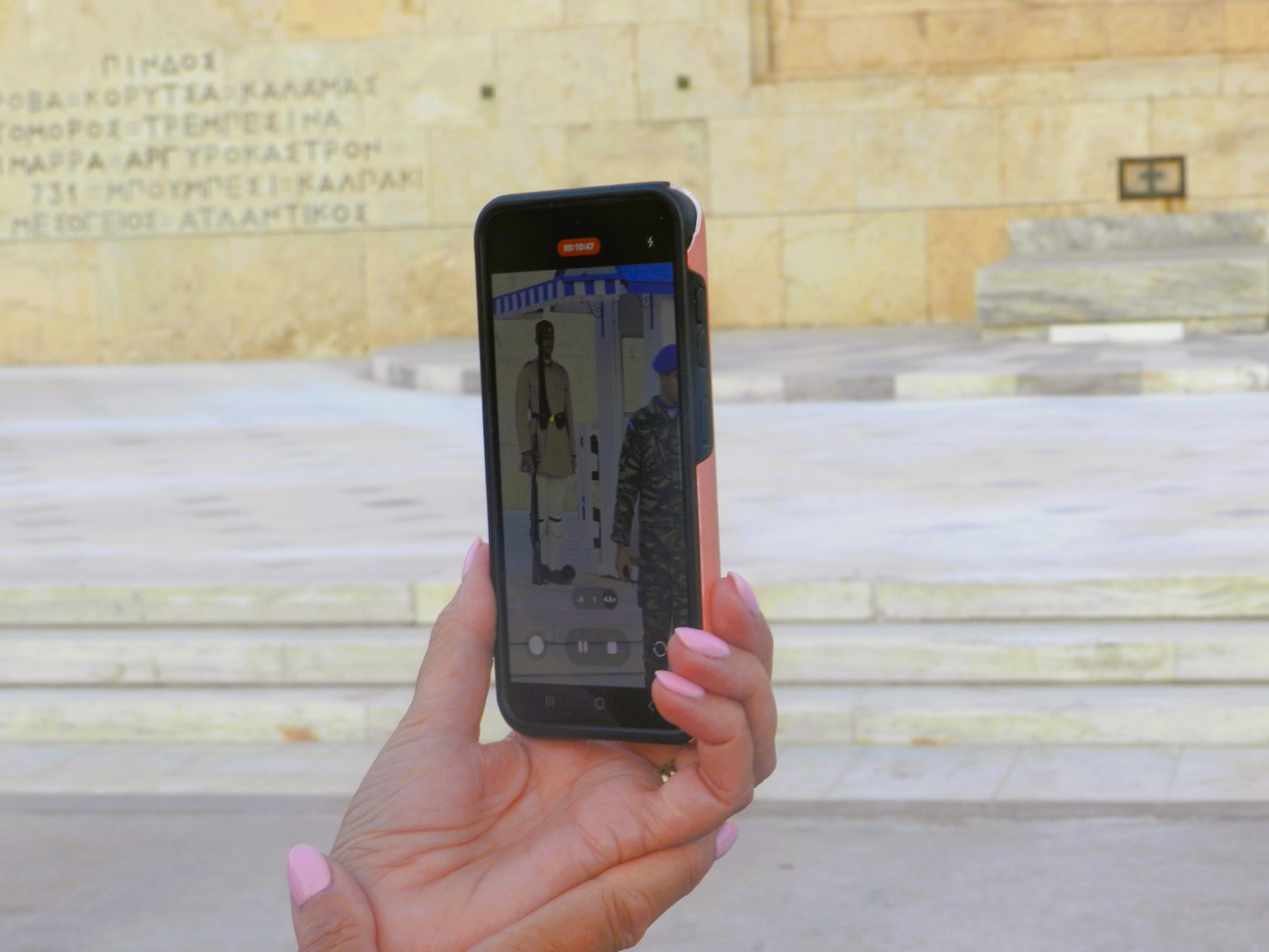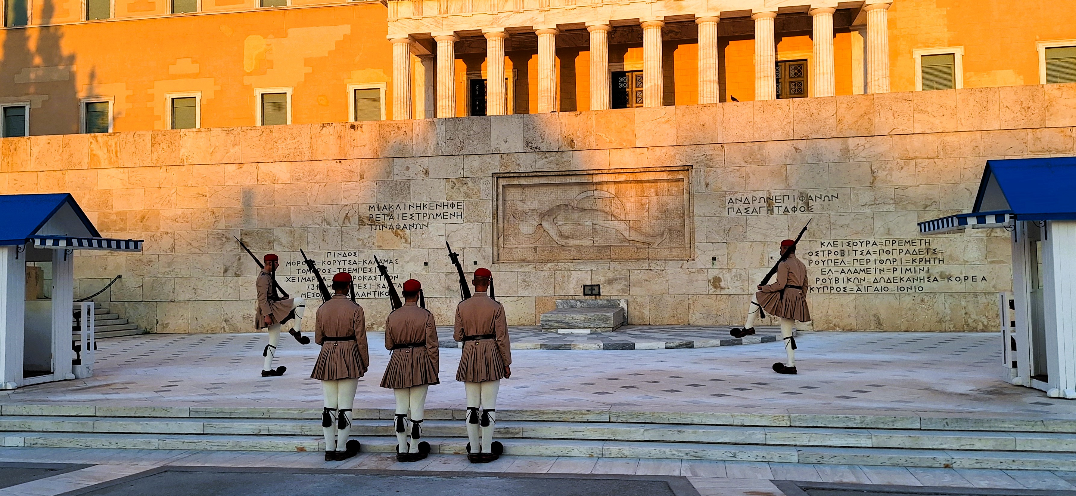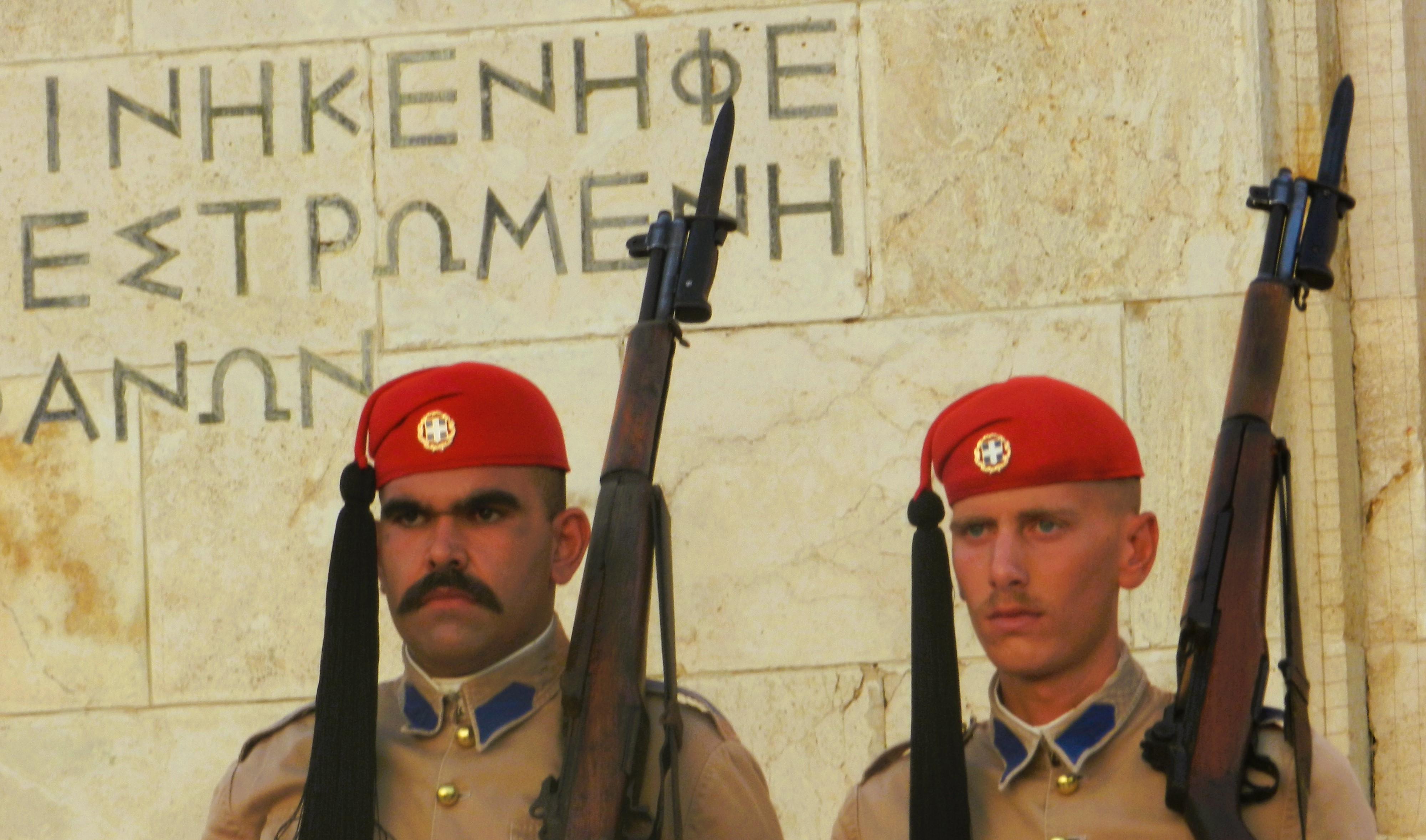 Junto a la plaza Syntagma está el monumento al soldado desconocido, guardado por un par de Evzones, la guardia presidencial griega (antes guardia real: seamos sinceros, «guardia presidencial» suena mucho peor que «guardia real»). La ceremonia del cambio de guardia se celebra cada hora todos los días salvo que llueva o haya griegos quemándolo todo en la plaza, cosa que sucede un par de veces al año de media. Los soldados están obligados a permanecer completamente quietos excepto cuando intercambian posiciones con movimientos gráciles como de grullas (se supone que representan caballos), algo que sucede cada quince minutos; un tercer soldado, vestido de militar estándar, les limpia el sudor. les da de beber agua y les coloca el uniforme, mientras los guardas permanecen absolutamente hieráticos y mirando a un punto varios kilómetros más allá del horizonte. Cuentan las crónicas que en una manifestación violenta hace un par de décadas un cóctel molotov cayó en la garita de uno de los Evzonoi, pero el soldado junto a ella ni siquiera parpadeó hasta que recibió la orden de escapar, ya con el uniforme chamuscado. Los turistas normalmente se empiezan a agolpar frente a los guardias unos veinte minutos antes de cualquier cambio de hora. En Atenas, en agosto, a mediodía, la temperatura es aproximadamente la misma que hay en el interior del horno de una fundición de acero, pero los soldados completan su tarea no sólo sin fallecer, como sería lo esperable, sino sin apenas inmutarse.