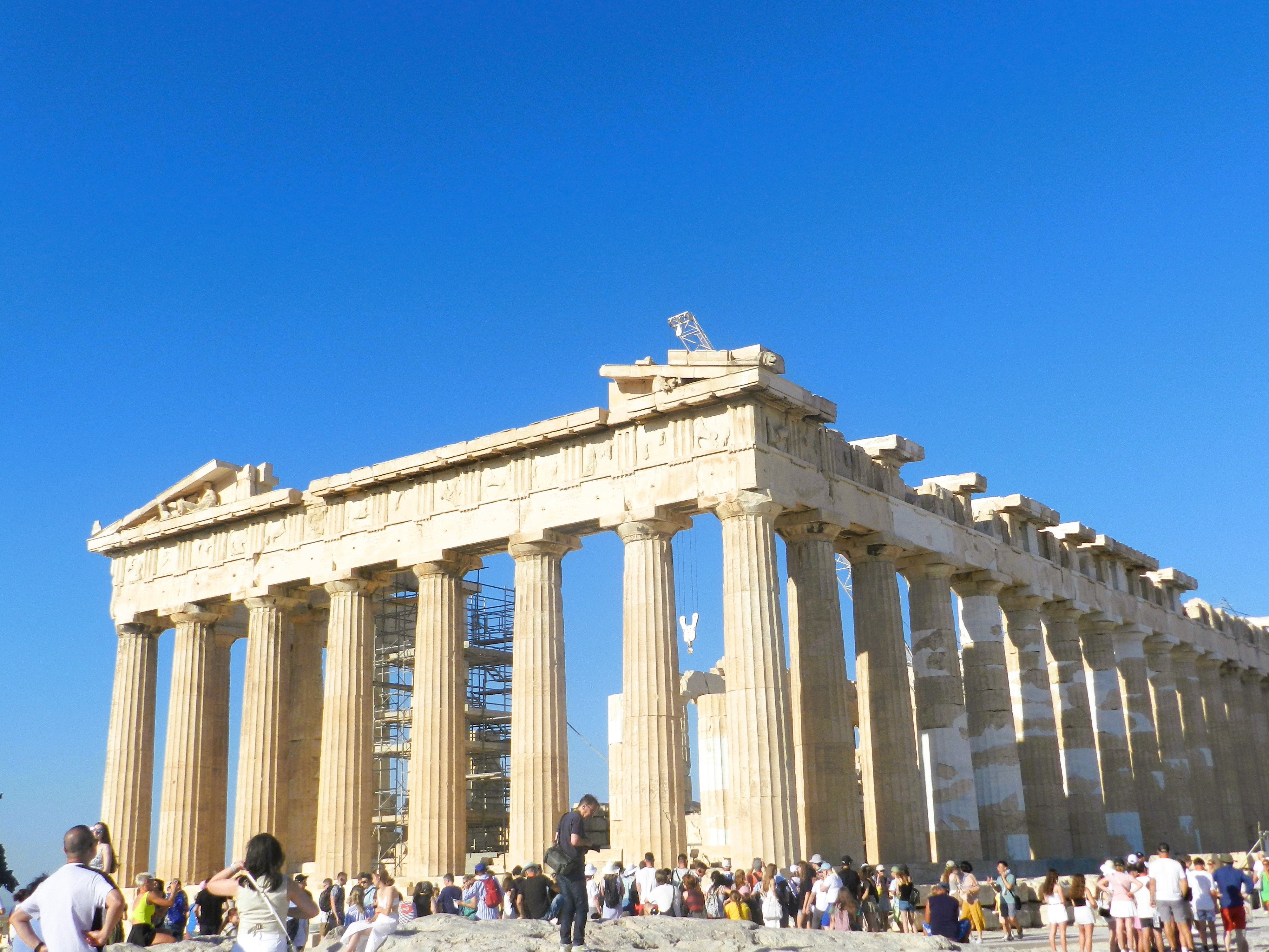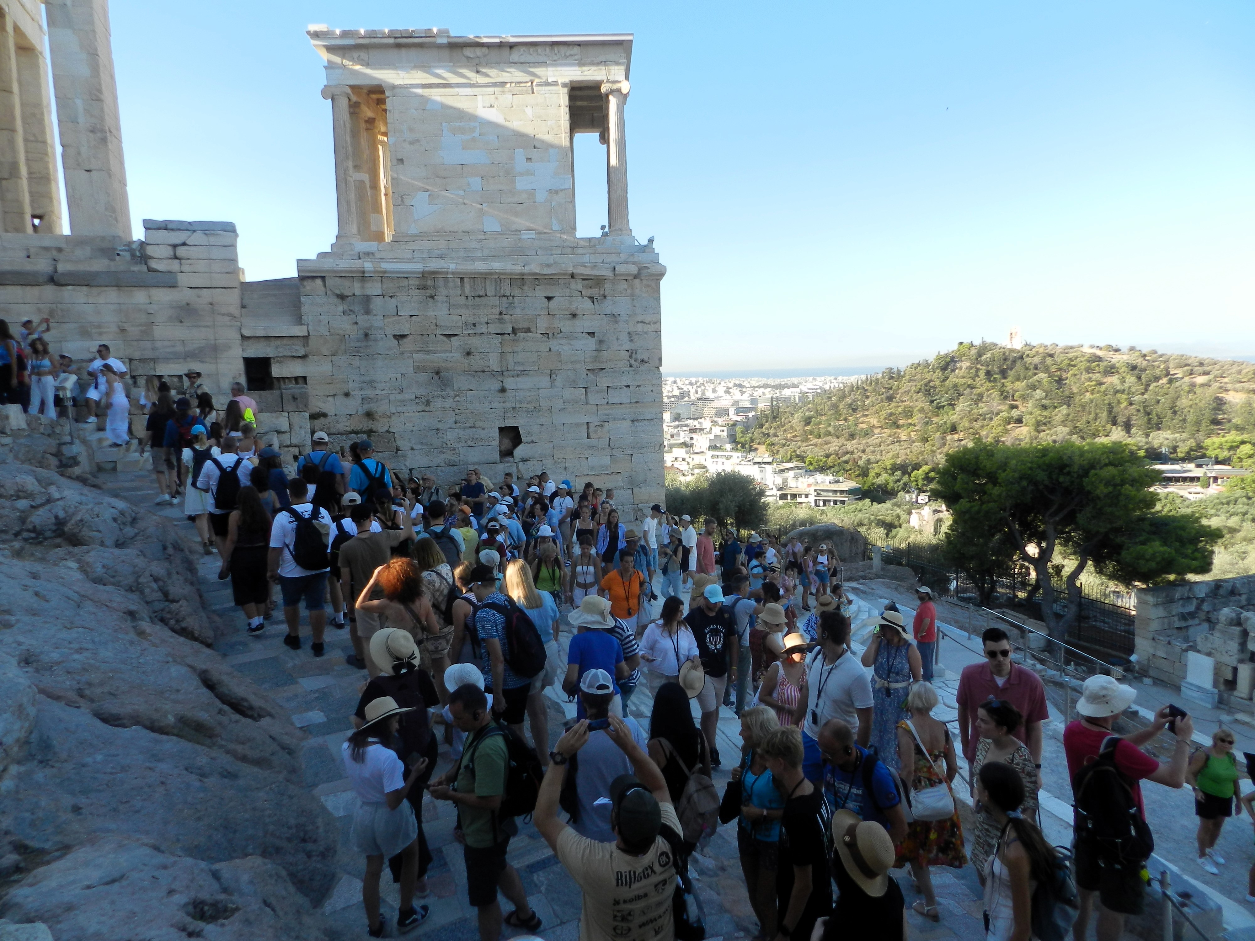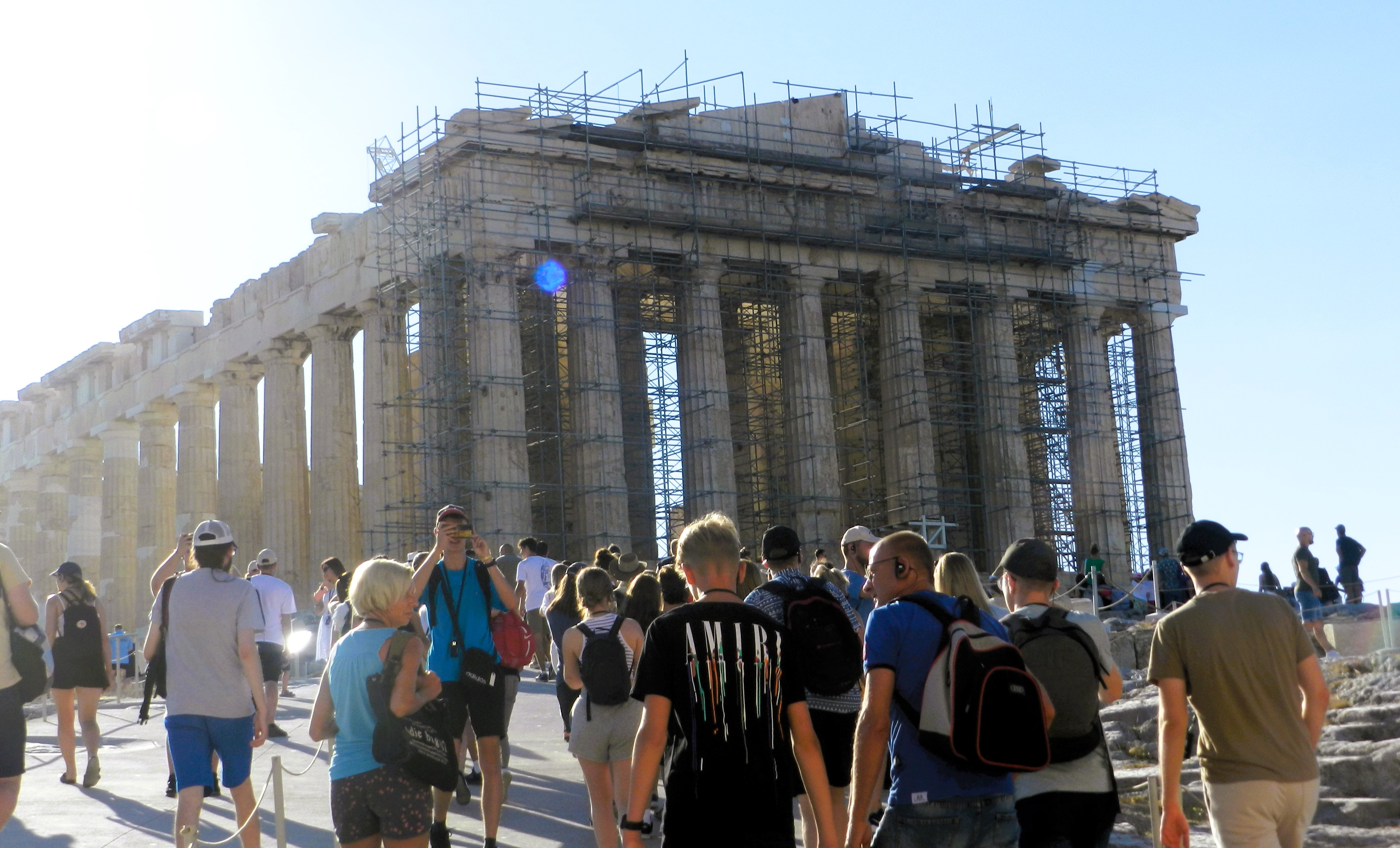 El ascenso al Filopapos nos sirvió de entrenamiento para la subida del día siguiente a la propia Acrópolis. En verano hay dos horas buenas para entrar: la primera y la última. Cualquier otra opción intermedia supone bracear en un aire espeso y caliente intentando mantener la conciencia y apartándose inútilmente el sudor de los ojos para poder ver alguna cariátide. Honestamente tampoco es que a primera hora aquello sea una fresquera. El termómetro marcaba veintinueve grados cuando a las ocho en punto cruzamos la verja de entrada junto con otras dos mil personas que tenían la misma hora impresa en sus tickets. Ascender la media docena de tramos de escaleras hasta la cima del monumento nos llevó algo más de media hora, sobre todo por la costumbre de pararnos a hacer fotos a literalmente cualquier cosa que pudiera resultar mínimamente interesante. «Oh, mira, un guijarro en medio del camino, seguro que tiene cinco mil años de antigüedad». El Partenón nos recibió impasible, como lleva haciendo un par largo de milenios. O bueno, no tan impertérrito, en realidad.