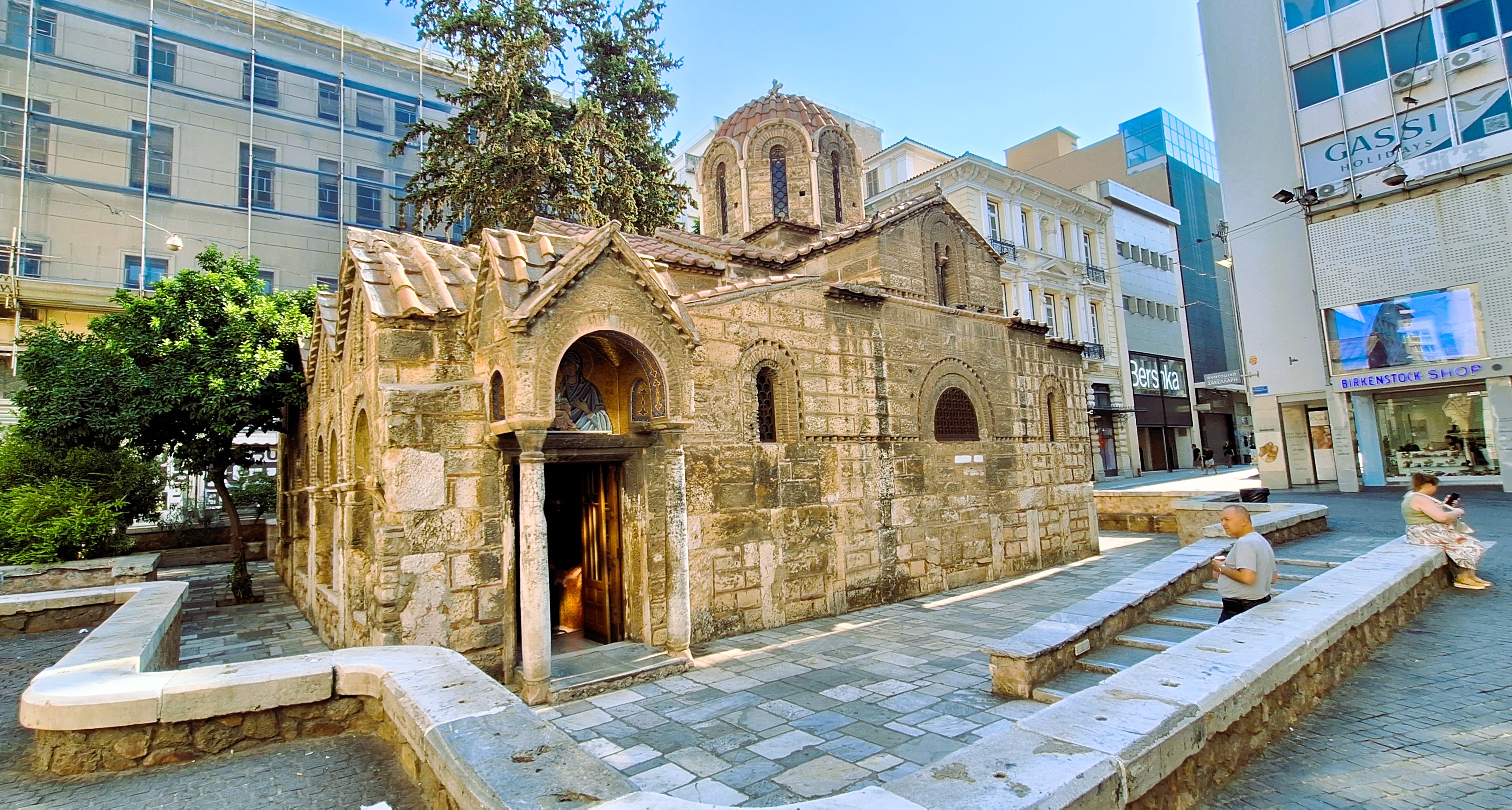 La calle Ermou baja directa desde la plaza Syntagma hasta la plaza Monastiraki, el otro lugar céntrico del que parten los free tours etcétera. Es una calle comercial, llena de las franquicias de Inditex que uno puede encontrarse en cualquier lugar del mundo, aparte de heladerías, tiendas de carcasas y demás. Uno la baja caminando alegremente, esquivando mendigos y vendedores callejeros hasta que pum, se encuentra con una capilla ortodoxa del siglo XIV cortándole el paso, como si fuera lo más normal del mundo, como si al Dios de los cristianos se le hubiera caído ahí por casualidad y le hubiera dado pereza agacharse a recogerla. Es algo bastante común en los alrededores del centro de Atenas. Pequeñas iglesias que brotan del asfalto como setas en el bosque, incólumes ante la transformación sufrida por la ciudad en los últimos, pongamos, dos o tres siglos.