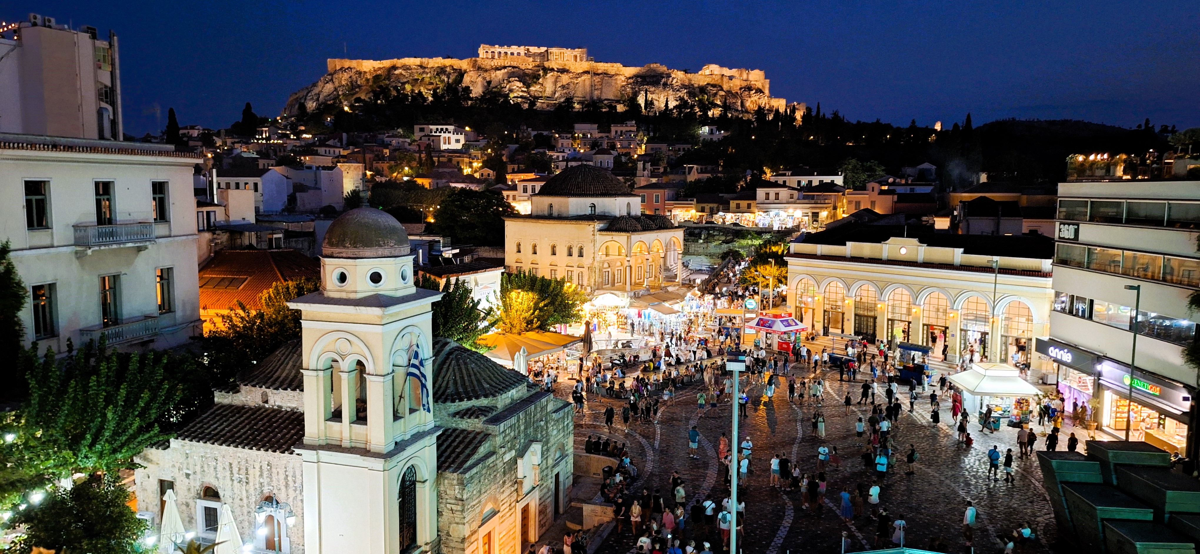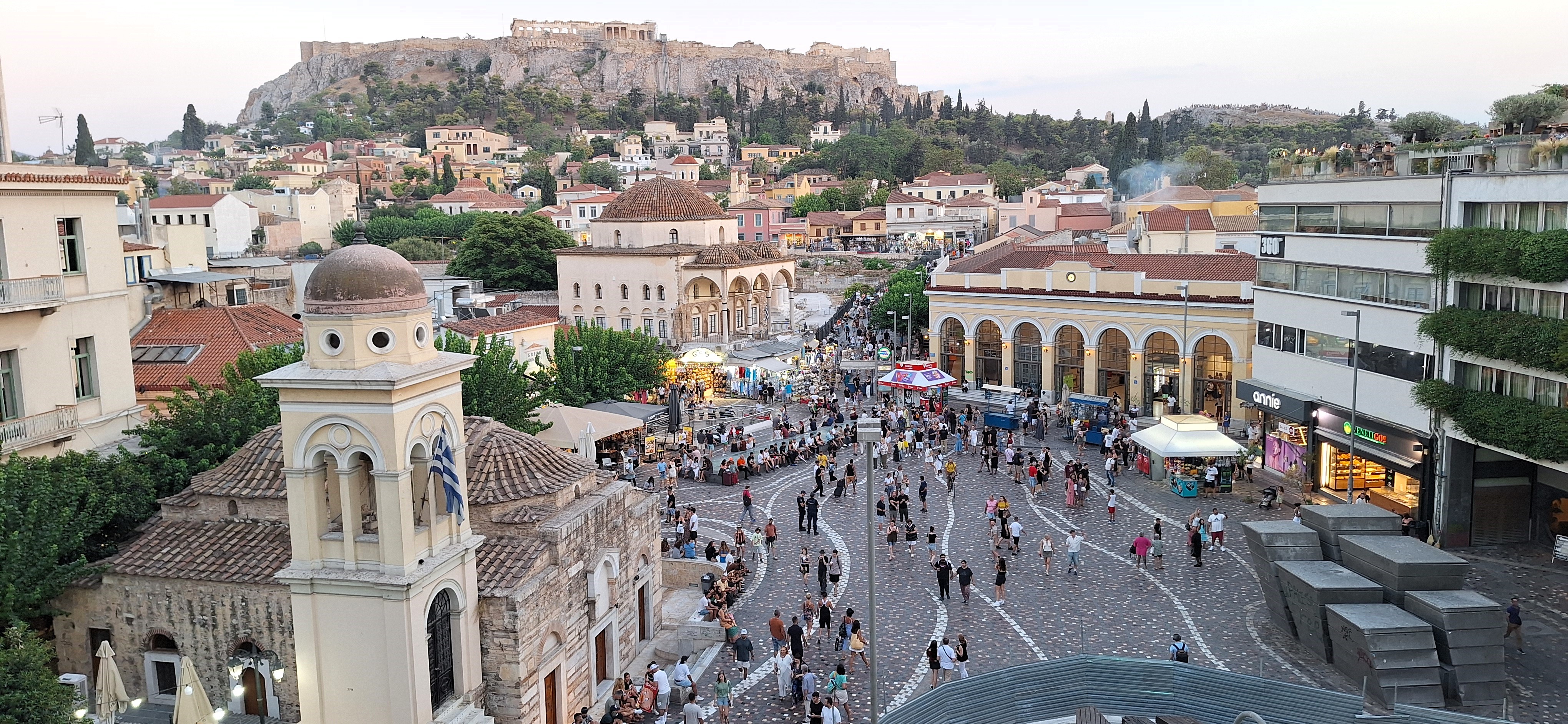 Desde Monastiraki hay unas vistas bastante bonitas de la Acrópolis, una colina que simplemente no tiene sentido; de nuevo, parece puesta ahí por una fuerza superior sobrehumana, por el mismísimo Zeus en un rato de aburrimiento jugando con la arena de la playa. Es fácil entender por qué en la antigüedad estos lugares eran sagrados; incluso en 2024 resulta sobrecogedor semejante mamotreto recortándose contra el cielo. Alrededor de la plaza abundan los rooftops, restaurantes en las azoteas de los edificios donde tomarse algo con vistas al Partenón. Nuestra primera noche en la ciudad cenamos en uno de ellos, viendo cambiar la luz según el sol se escondía en el Pireo. La cena salió a treinta euros por persona, propina incluida. Probablemente la más barata de nuestras vidas.