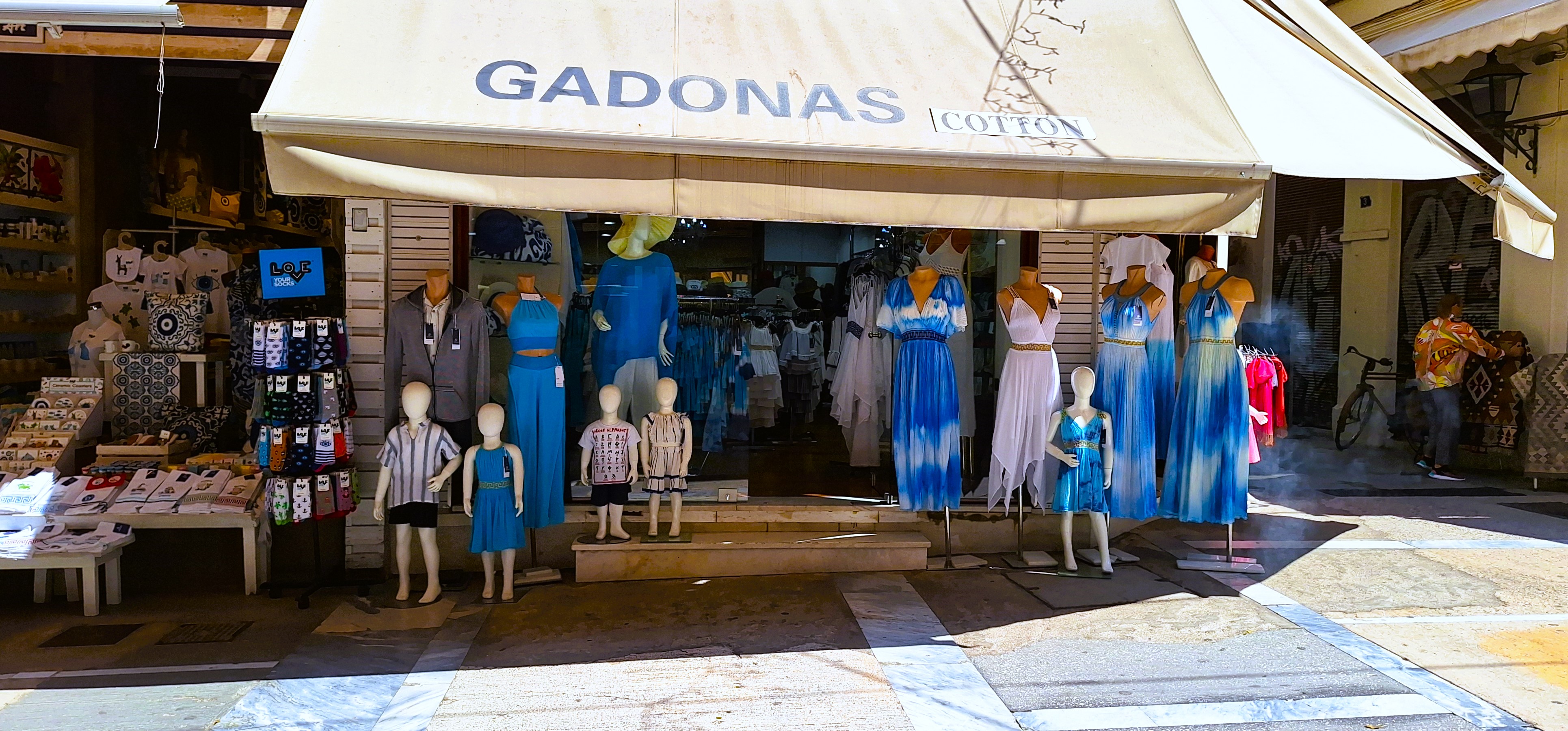 Junto a Monastiraki está el barrio de Plaka, que durante nuestra estancia denominé, una y otra vez «plaka plaka«, haciendo el gesto de golpear algo en el aire con una y otra mano, porque uno puede tener 45 años pero toda la vida será un preadolescente mental. Plaka es el barrio hípster de Atenas, uno de ellos, al menos. Es donde están los restaurantes más típicos y las tiendas más cuquis, todos ellos dominados por el color azul de la bandera y del cielo griegos. De Monastiraki parte el recorrido del mercadillo, un bazar a la turca de callejones estrechos y tiendas abigarradas con estanterías atestadas de mercancía. Se nota mucho que Grecia estuvo cuatro siglos bajo dominio turco, no sólo en los cuatrocientos pliegues de los trajes de gala de los Evzonoi, sino porque la cocina, el paisaje y también el paisanaje son extremadamente parecidos a uno y otro lado del Egeo.