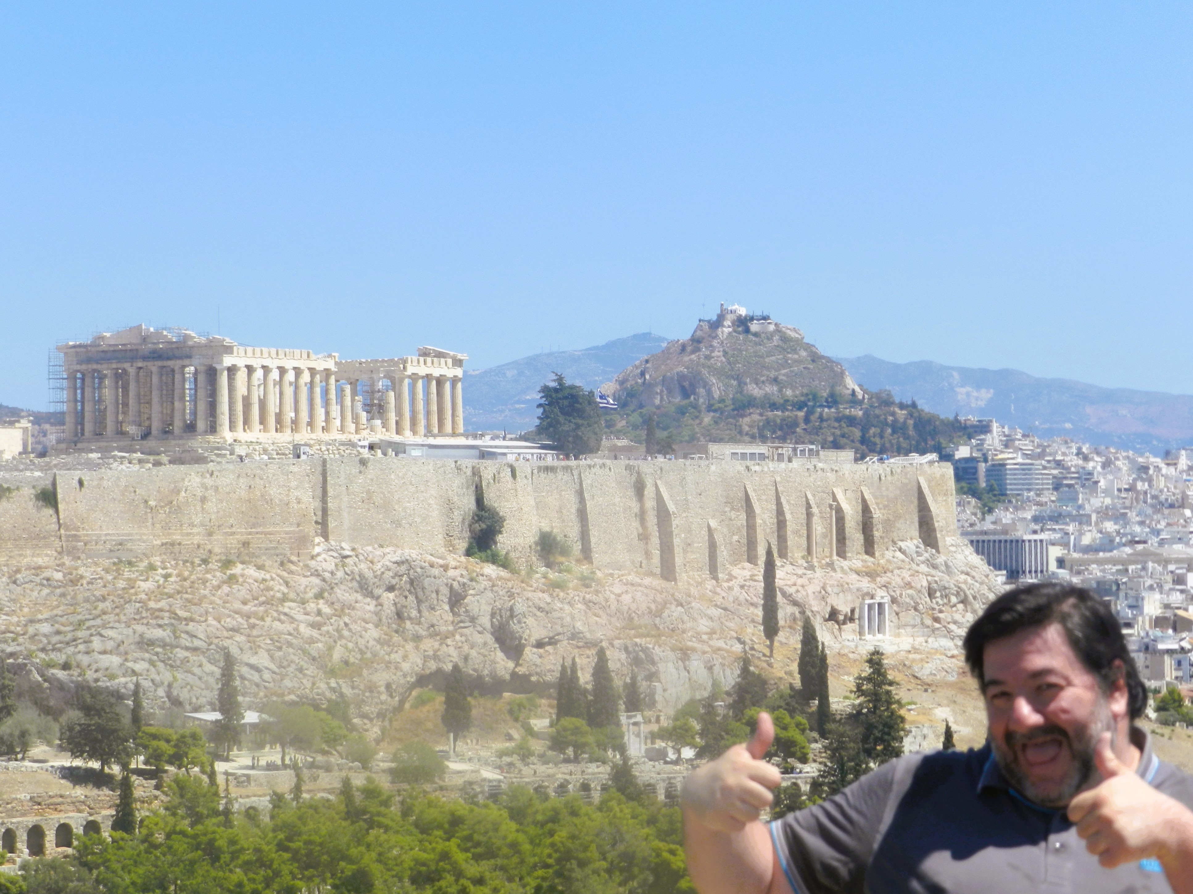 Pero vayamos a lo gordo. El piedro. La Acrópolis. El mejor sitio para hacer fotos del Partenón no es ese, sino el monte Filopapos, al otro lado de la calle, como quien dice. Desde la parada de metro más cercana son unos mil quinientos metros de caminata con unos setenta de desnivel, no es gran cosa, salvo que, como es mi caso, se desplace una masa equivalente a la de un tigre de Bengala adulto, y además la temperatura sobrepase los cuarenta grados a la sombra. Nos llevó un ratito completar el ascenso, probablemente porque nos paramos en un bar a comer fruta y beber zumos, y porque nos detuvimos literalmente debajo de cada árbol para evitar terminar como un japonés cualquiera en la Hiroshima de 1945. Hacía calor, insisto. Pero la parrillada mereció la pena, las vistas eran espectaculares y además se puede visitar el monumento que comparte nombre con el monte, un mausoleo de casi dos milenios de antigüedad que lleva ahí, inmutable, desde que se erigió en el siglo I de nuestra era. Hacían cosas bien aquellos romanos de Grecia.