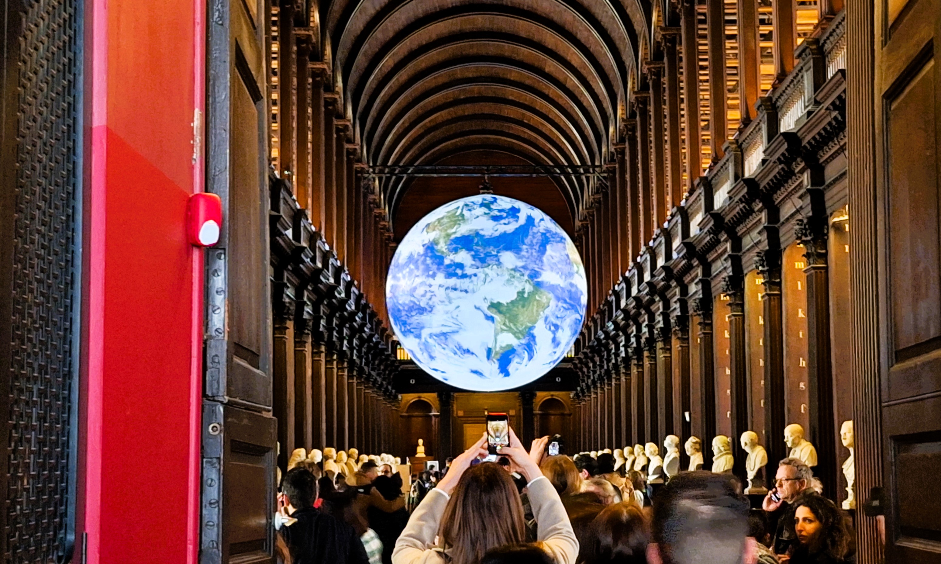 Lo que más me gustó de Dublín, como me suele pasar con todas las ciudades, fue pasear. Especialmente junto al río, cruzado por dieciséis puentes, de los cuales sólo dos son del inevitable Calatrava, los que llevan los nombres de James Joyce y Samuel Beckett. Este último es un puente atirantado que evoca la figura de un arpa, aunque a los españoles inevitablemente nos traiga a la cabeza el Puente del Alamillo, que es del mismo tipo. El arpa es el símbolo nacional de Irlanda, y además de en el escudo de armas del país, figura en el logotipo de las dos empresas más reconocibles fuera de la isla: Ryanair y Guinness. Todas ellas están basadas en la llamada Arpa de Brian Boru, que se encuentra en el Trinity College, la institución universitaria más importante de Irlanda, la mitad de cuyos alumnos aparentemente aparecen en azul en la Wikipedia. Hacia allí nos dirigimos para ver no sólo el arpa y la biblioteca en la que se encuentra sino también el Libro de Kells, un manuscrito de milenio y pico de antigüedad considerado la cumbre del arte de la miniatura en la Alta Edad Media. Alrededor del libro hay organizada una entretenida exposición con su inevitable ración de digitalización inmersiva, que sirve fundamentalmente para multiplicar por tres el precio que el turista medio está dispuesto a pagar por ver el libro.