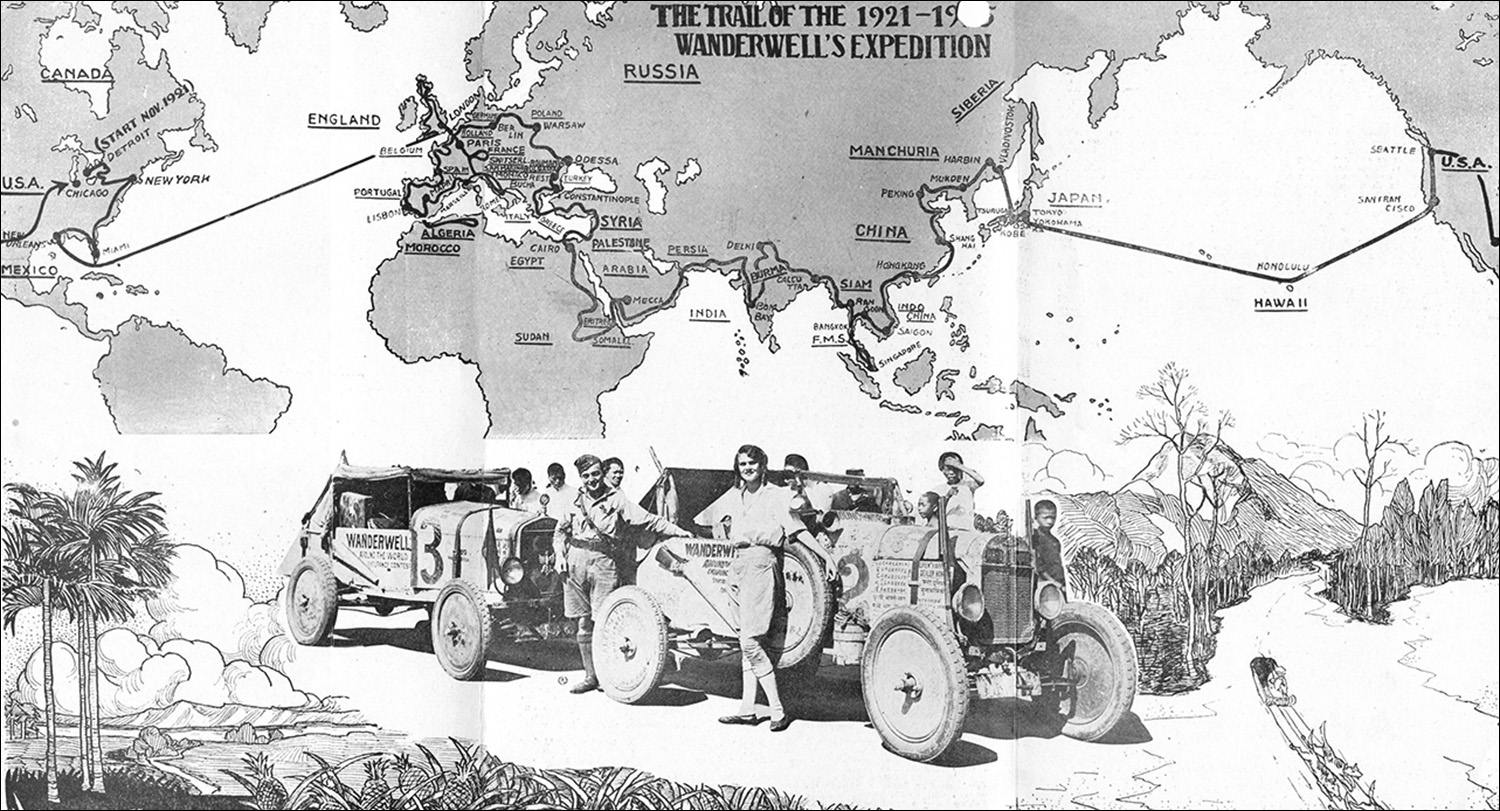 Hace cien años las carreteras asfaltadas no existían en casi ningún lugar del mundo, y lo mismo se podía decir de las gasolineras. Para recorrerse miles de kilómetros por junglas y desiertos los expedicionarios tenían que tirar de imaginación, y recurrieron a plátanos machacados o sebo de elefante para engrasar el coche. Para coincidir con la expedición que llevaba a cabo la primera vuelta al mundo en avión, recorrieron tres mil quinientos kilómetros cada uno en un coche entre Adén, en Yemen, y Calcuta, en la India, mientras el resto de la expedición se quedaba en Egipto intentando solucionar problemas burocráticos. Por el camino pasaron por la Meca, donde Aloha, con sus seis pies de estatura, se disfrazó de hombre para poder visitar la ciudad. Durante la mayor parte del camino la carretera eran dos huellas de carreta tirada por bueyes a lo largo de terrenos inhóspitos que destrozaban neumáticos y amortiguadores con la misma facilidad con la que un niño aplasta una hormiga entre los dedos.