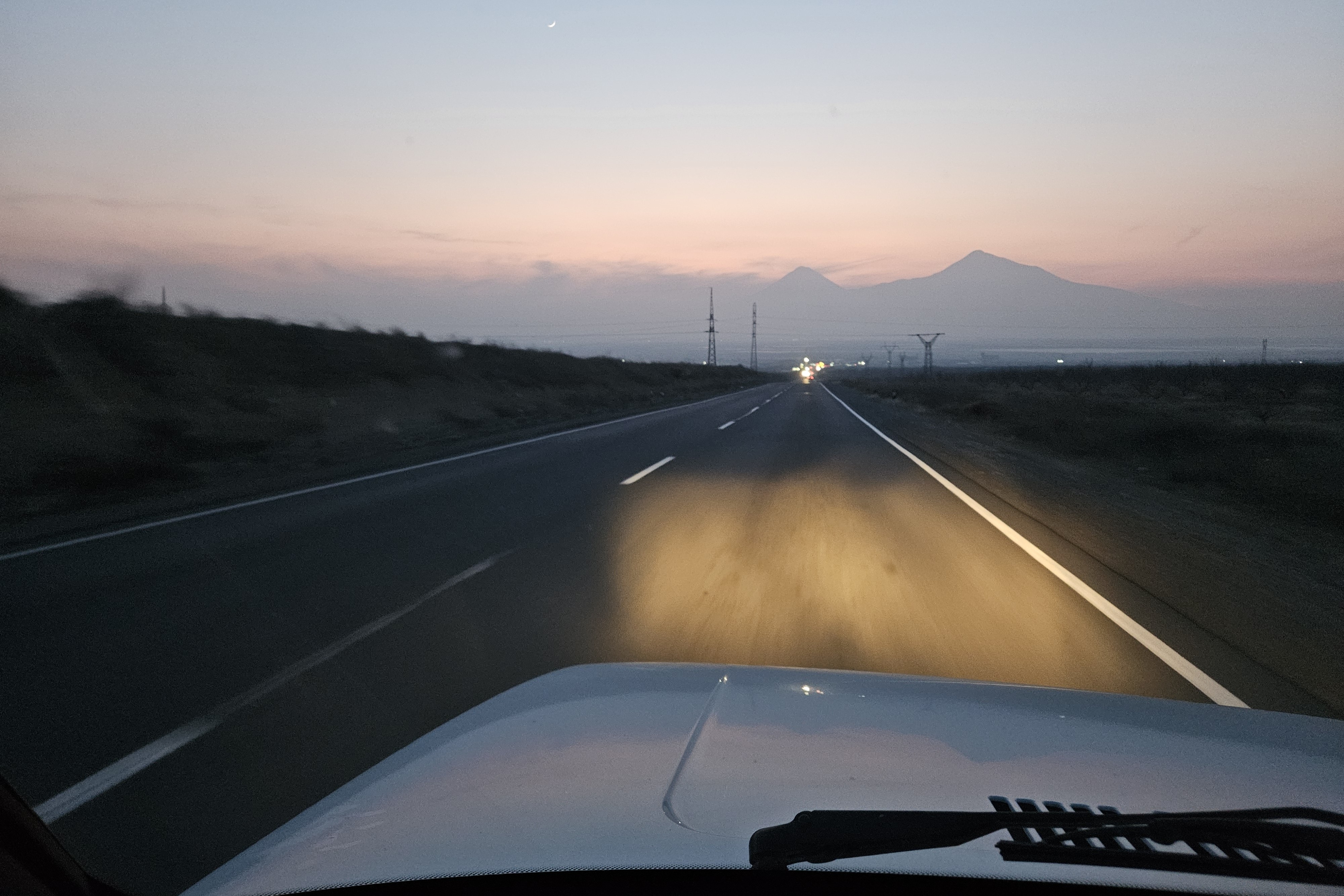 El día estaba soleado y completamente despejado, lo que nos hizo pensar que sería ideal para deleitarnos viendo las montañas pero, al salir de la ciudad, seguíamos sin ver nada: domina la zona urbana una polución fuerte y densa, acentuada por la falta de vientos y las quemas domésticas típicas del invierno. Veníamos por la autopista más o menos a la altura de Araksavan cuando a mi derecha por fin pude percibir la silueta y la cumbre nevada del Ararat. Estábamos a poco más de 30 kilómetros de distancia en línea recta, por lo que en este punto la montaña ya se asomaba como un fantasma gigante. Quedamos simplemente deslumbrados; de la boca de Diego no dejaban de salir sinónimos de “joder, tío” y “hostia, mira qué pedazo de montaña”. Nos sentíamos culpables de estar tan cerca y no parar para contemplarla así que nos metimos en la primera salida disponible para hacer nuestras primeras fotos desde algún pueblo, jugando con la perspectiva del lugar.