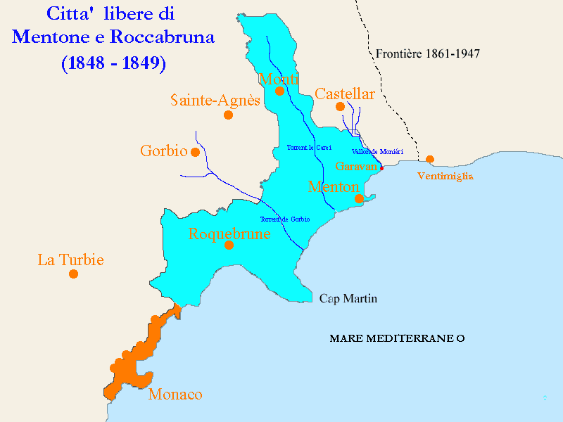 Las Ciudades Libres de Roccabruna y Mentone, administradas por Cerdeña y cedidas a Francia en 1861