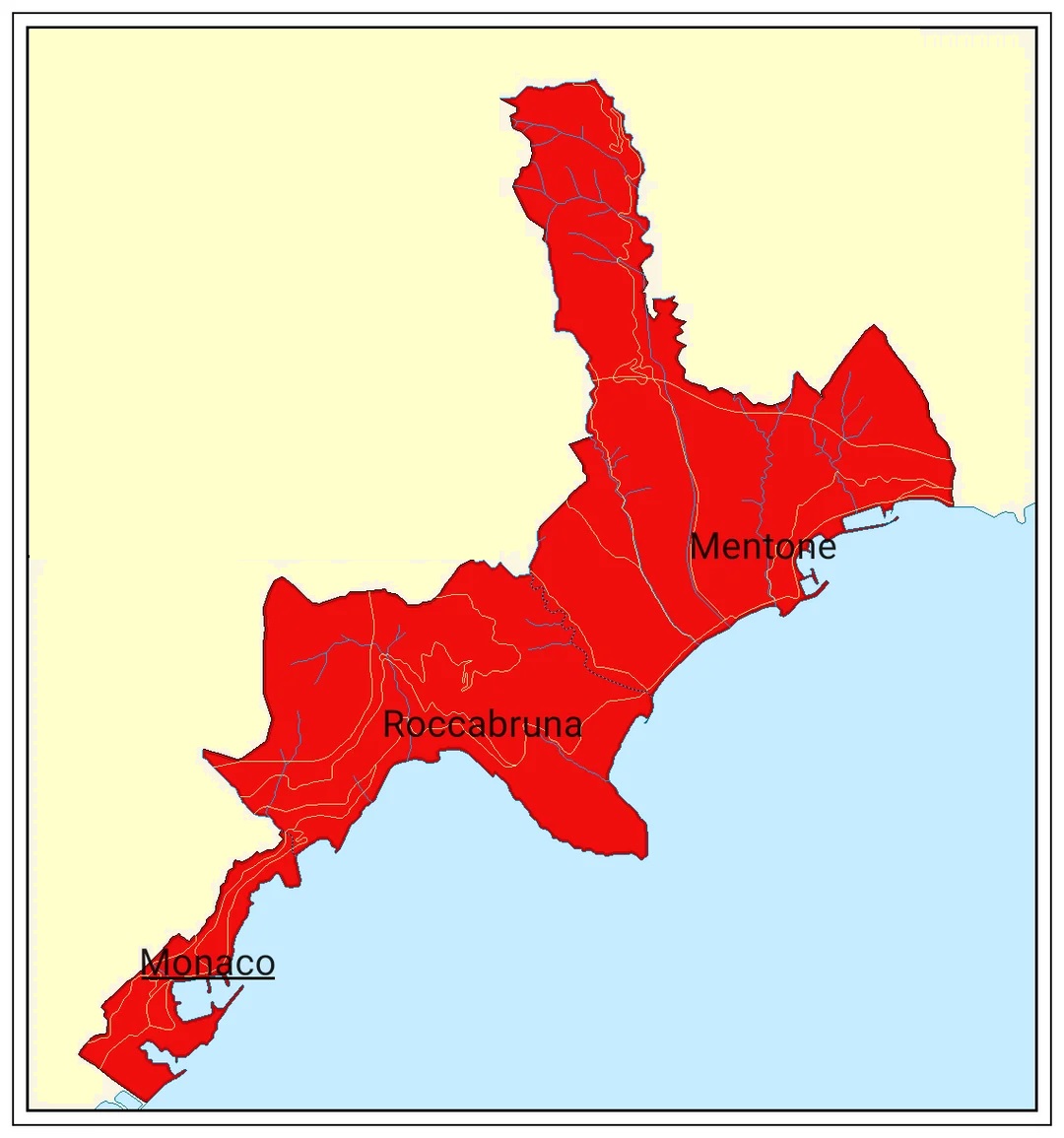 Mónaco y sus adquisiciones de mediados del siglo XIV: Roccabruna y Mentone (adaptado de este mapa de Reddit)