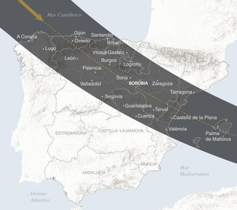 Empecemos con lo básico. La trayectoria de la totalidad abarcará buena parte de la mitad superior de España; podrá ser vista desde veintiocho provincias, y desde doce de ellas se podrá ver en todo su territorio. Veintidós capitales provinciales disfrutarán del espectáculo; aproximadamente catorce millones de personas residen en la zona de totalidad. La tercera y cuarta ciudades de España (Valencia y Zaragoza) están incluidas integramente en la franja donde el eclipse alcanzará el 100%; Madrid y Barcelona no, pero por muy poquito. En el caso de la Ciudad Condal, el eclipse total se podrá ver desde Vilanova y la Geltrú, a unos cuarenta kilómetros al sur de Barcelona. En la capital, sólo se podrá ver el sol completamente oculto desde el Aeropuerto de Barajas, donde el eclipse durará unos veinte segundos, y en algunos barrios del norte de la ciudad, como Las Tablas o Valdebebas, donde la duración será aún inferior. En la provincia, cuanto más al norte y al este mejor. La Sierra norte y el Corredor del Henares también quedarán dentro de la zona oscura.