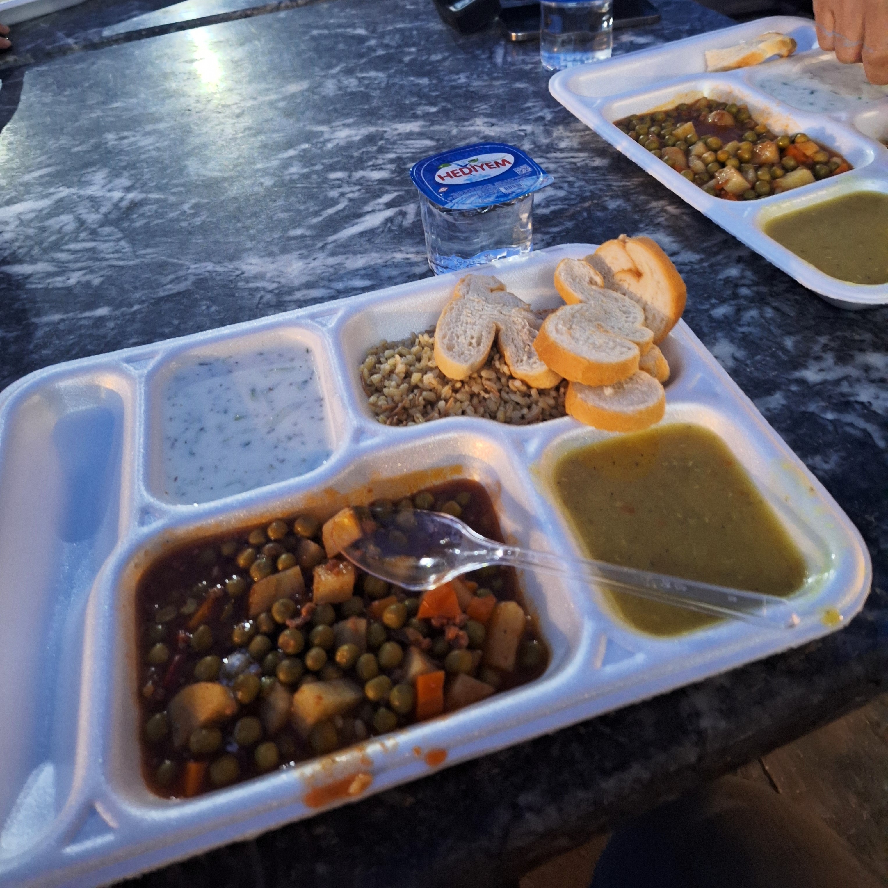 Según se ponía el sol la voz del muecín resonaba por el centro de Famagusta. Estábamos dando un paseo y visitando la mezquita, también una ex catedral reconvertida en el siglo XVI. Justo ante la puerta principal se encontraban las mesas colocadas para el tradicional Iftar, la ruptura del ayuno comunitaria que se celebra cada día durante el Ramadán. Numerosas personas estaban ya sentadas allí con sus bandejas, esperando a que terminara el Maghrib, el cuarto de los rezos diarios del Islam. Javi y yo nos miramos y nos preguntamos si nos dejarían comer, especialmente teniendo en cuenta el aspecto obvio de guiris que calzamos. Nos pusimos a la cola y efectivamente nadie nos preguntó nada. Respondimos cortesmente alhamdulillah mientras nos servían y nos sentamos mezclados con la muchedumbre. Nosotros no habíamos ayunado, obviamente, pero la merienda (eran poco más de las seis y media de la tarde) nos sentó fenomenal. Y, por qué no decirlo, también subió un poco nuestra estima hacia el país.