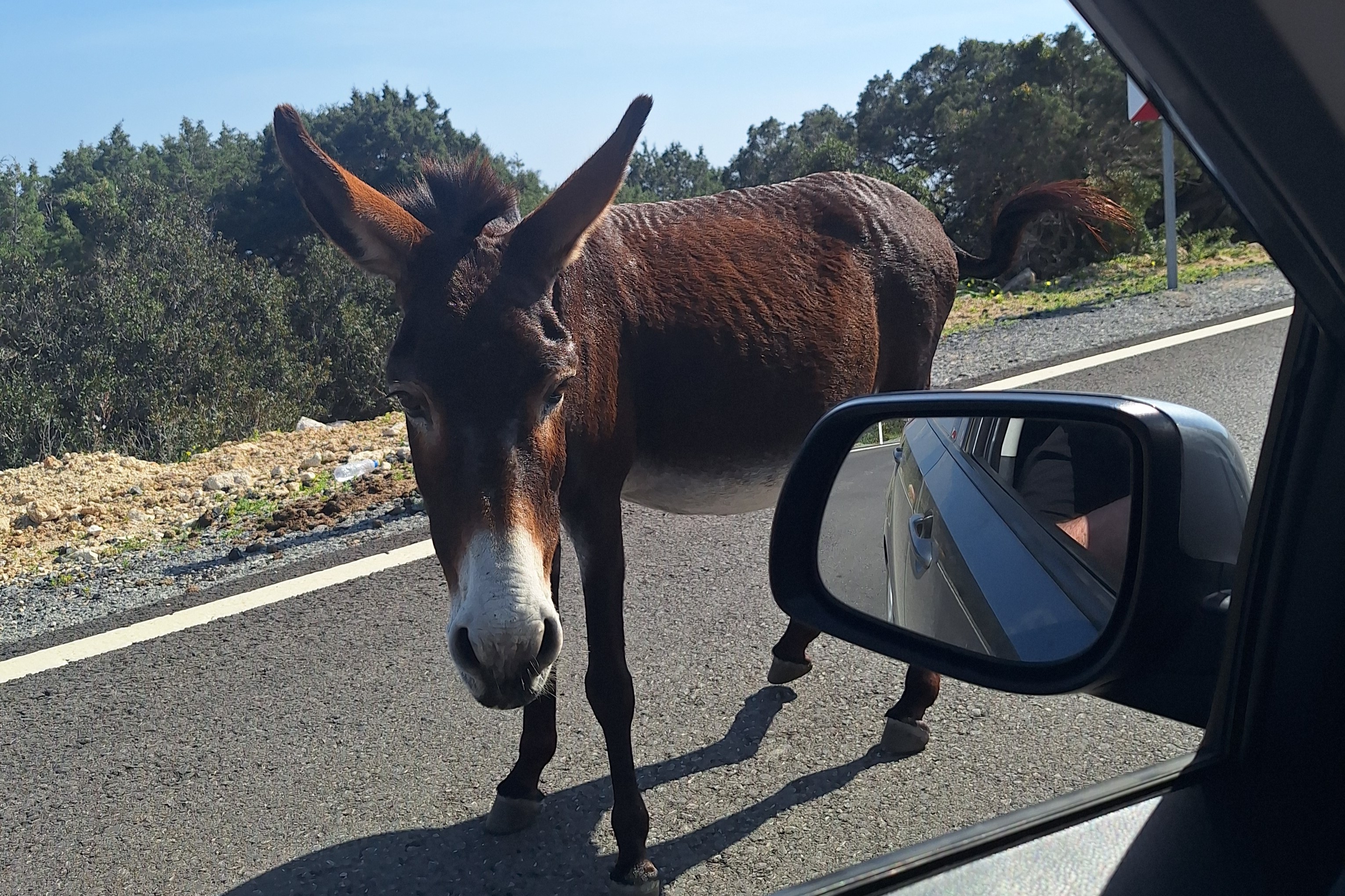 Una autocaravana con matrícula del cantón suizo de Lucerna se detuvo a nuestro lado mientras nos hacíamos fotos junto a la cancela del parque. El matrimonio que viajaba en ella estaba en pleno año sabático y habían decidido recorrerse todo el camino entre su ciudad y Bangkok a lo largo de trece o catorce meses. Chipre del Norte era el país número 15 de su periplo, pero el único del que no habían encontrado una bandera para pegar en la parte trasera del vehículo. Cosas de los países no reconocidos. La mayoría de los burritos que habitan esta parte de Chipre son descendientes de los que abandonaron los granjeros griegos durante la invasión de 1974, y están más que acostumbrados a la presencia humana, y a que les ofrezcan zanahorias y manzanas desde la ventanilla del coche. nosotros no teníamos así que nos ignoraron, pero los suizos venían extremadamente preparados y dieron de comer a todos los animales que encontraron. La carretera empeoraba cada vez más hasta convertirse en un camino rural lleno de agujeros, pero decidimos seguir adelante porque, he repetido muchas veces esta frase, hemos venido a jugar. Al final del camino nos esperaba una piedra indicando el final de la isla, unos pocos burros más, y una gata bien alimentada y extremadamente cariñosa. Desde allí hay sólo cien kilómetros hasta la costa siria.