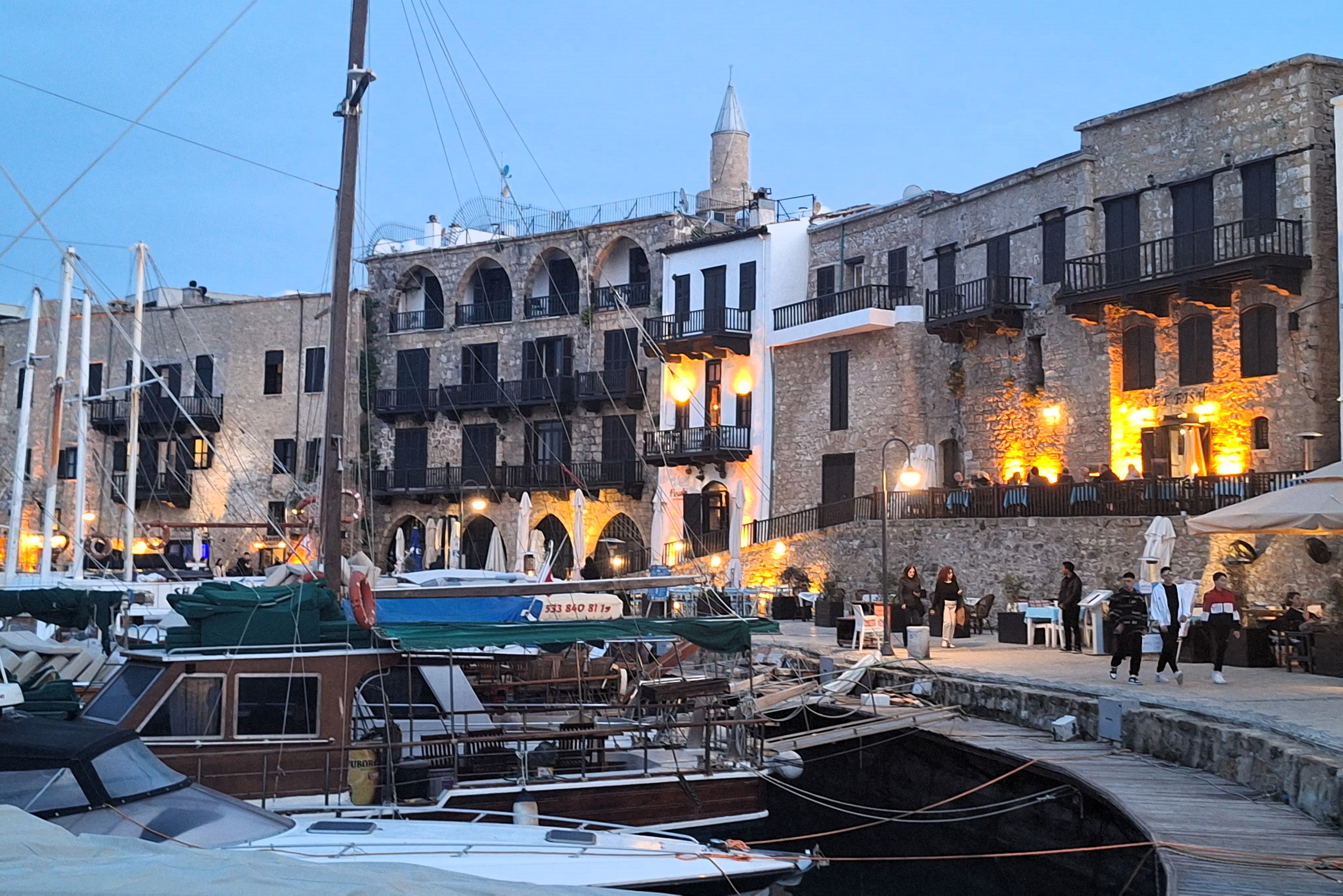 Regresamos a la civilización y nos dirigimos a una de las ciudades más turísticas de Chipre del Norte y de toda la isla: Kyrenia. Por el camino volvimos a encontrarnos más de un centenar de urbanizaciones en construcción. No he encontrado cuánto dinero ha entrado en el ladrillo norchipriota en el último lustro pero dudo que baje de las decenas de miles de millones de euros. Kyrenia, o Girne en turco, es un lugar que lleva tantos años siendo relevante que ya aparecía en la Tabula Peutingeriana, la Guía Michelín del Imperio Romano, datada alrededor del siglo V de nuestra era. Su primera mención conocida, sin embargo, es casi un milenio más antigua, en el Periplo de Pseudo Escílax, un manual náutico de la circunnavegación del Mediterráneo procedente del siglo III antes de Cristo. Milenios de historia griega llegaron a su fin en 1974, cuando tres cuartas partes de los habitantes de la ciudad fueron expulsados o huyeron. Fueron sustituídos por refugiados del sur de la isla o por turcos del continente, pero el puerto no ha perdido un solo gramo de su sabor mediterráneo, y la localidad tiene una vida nocturna animadísima, incluso un jueves de marzo. La orilla del mar está plagada de casinos para rusos y turcos, con el gusto estético esperable, pero por suerte sólo en el interior. Por fuera el paseo marítimo podría estar en cualquier lugar entre el Algarve y el Peloponeso. Después de pagar un sobreprecio monumental por un par de cervezas regresamos a nuestros cuarteles al sur de la isla