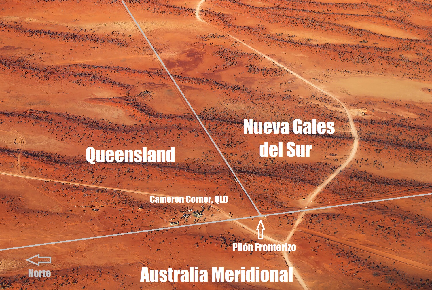 Vista aérea del trifinio, con el pueblo de Cameron Corner pegado a la raya de Queensland (Georgie Mann)El mojón fronterizo señalando el trifinio entre las tres provincias australianas (Exploroz)